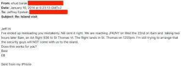 How badly did Barak want to get to pedo island without security? EH: “I’m still trying to arrange that the security guys will NOT come with us to the island,” Barak wrote. “Does this works for you?” Epstein later responded by noting that a helicopter would pick up Barak once his flight from New York landed on St. Thomas.