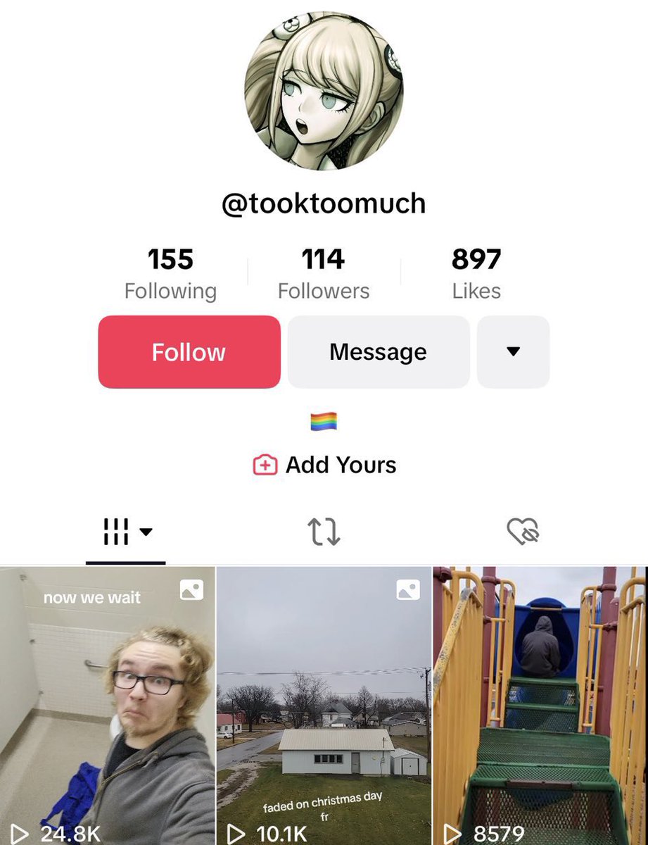 BREAKING: TikTok has scrubbed an account that allegedly belonged to the Perry High School shooting suspect, Dylan Butler. Luckily, I captured a screen recording of the account before it was taken down. The account was named 'tooktoomuch' and featured a pride flag in the bio. The person who owned the account appeared to be a loser, mentally ill, druggy. He was also in a pretend gun fight with one of his friends in one video.