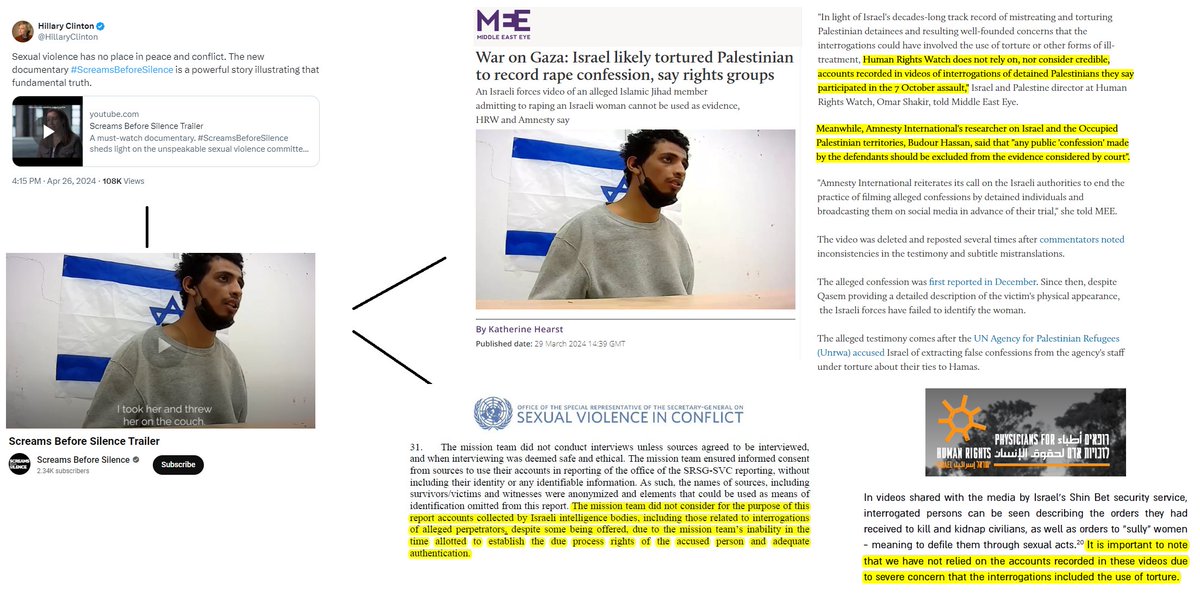 BREAKING: Hillary Clinton, Sheryl Sandberg and the Western media and political class are laundering torture and violating every basic principle of human rights: In the hoax documentary just promoted to her audience of millions, Hillary Clinton, who is herself married to a serial pedophile gang rapist and defended him while smearing his victims, is promoting a documentary by Sheryl Sandberg that prominently uses forced tortured "confessions" as her key "evidence" for the "mass rape" hoax, alongside long ago debunked liars and hoaxers from Zaka and Shari Mendes. Every human rights organization and the UN said this violates every ethical and legal standard, and the "confessions" which are themselves debunked as they do not match any corroborating evidence, should not be accepted by anyone as they were extracted by torture and threats to rape and kill themselves and their family members, a routine practice of the genocidal Israeli regime. This is what Sheryl Sandberg and Hillary Clinton and the rest of the Western media class are now proudly laundering and saying is totally fine to use as "evidence"": Forced tortured "confessions. This means that any other government now, Russia, Iran, Venezuela, China, North Korea, can freely tortured anyone they like, get a "confessions", splash it across their media, and the West now has to accept it as valid evidence. Evan Gershkovich who is now jailed in Russia? Torture him over and over again, violently, repeatedly, then tape his confession, and Hillary Clinton and Sheryl Sandberg who have been crying about him endlessly will have to accept that as evidence of his guilt. That is the pandora's box disgusting depraved genocidal propagandist creeps in the Western media and political class have now opened with glee because they were so desperate to launder their precious "mass rape" hoax.