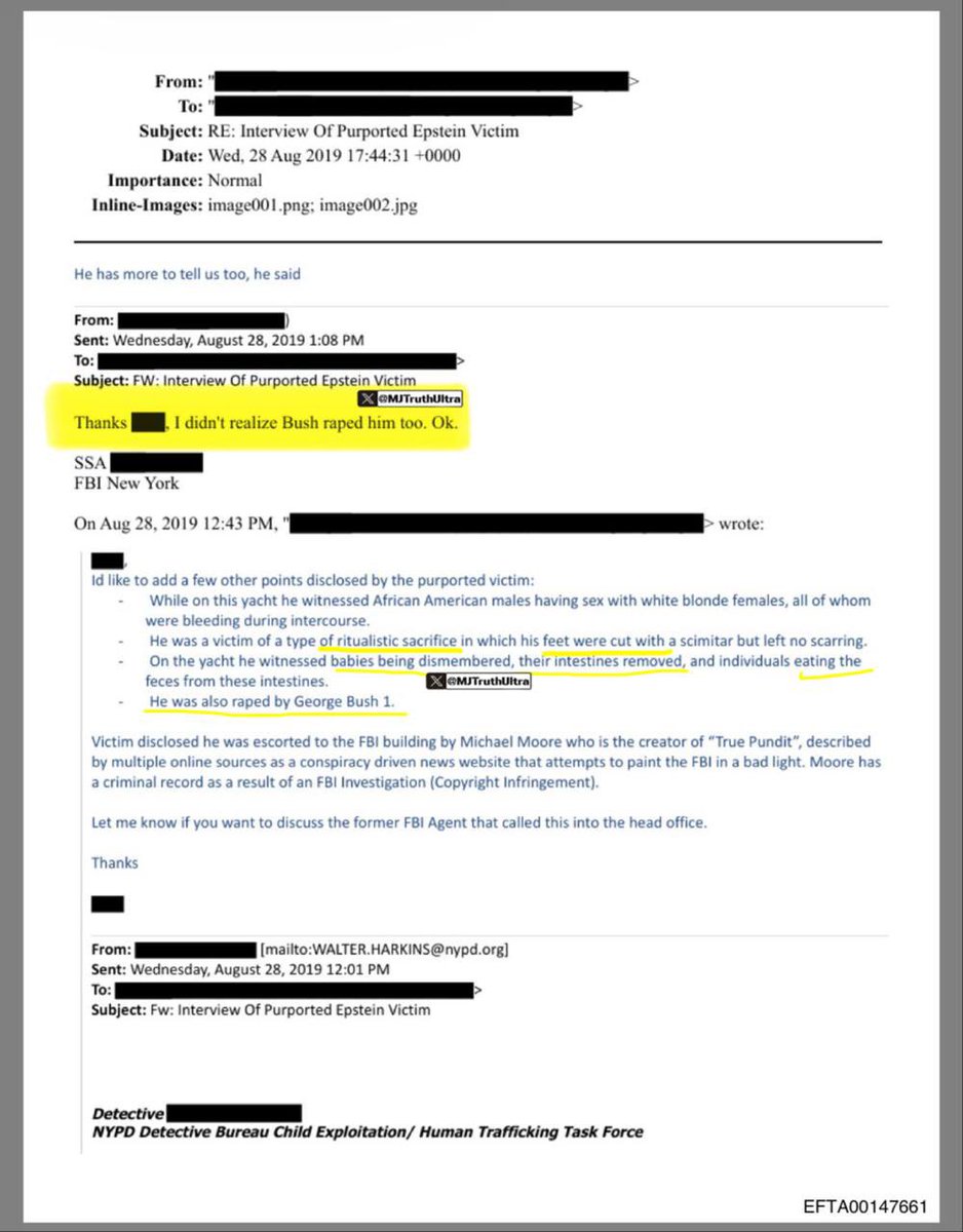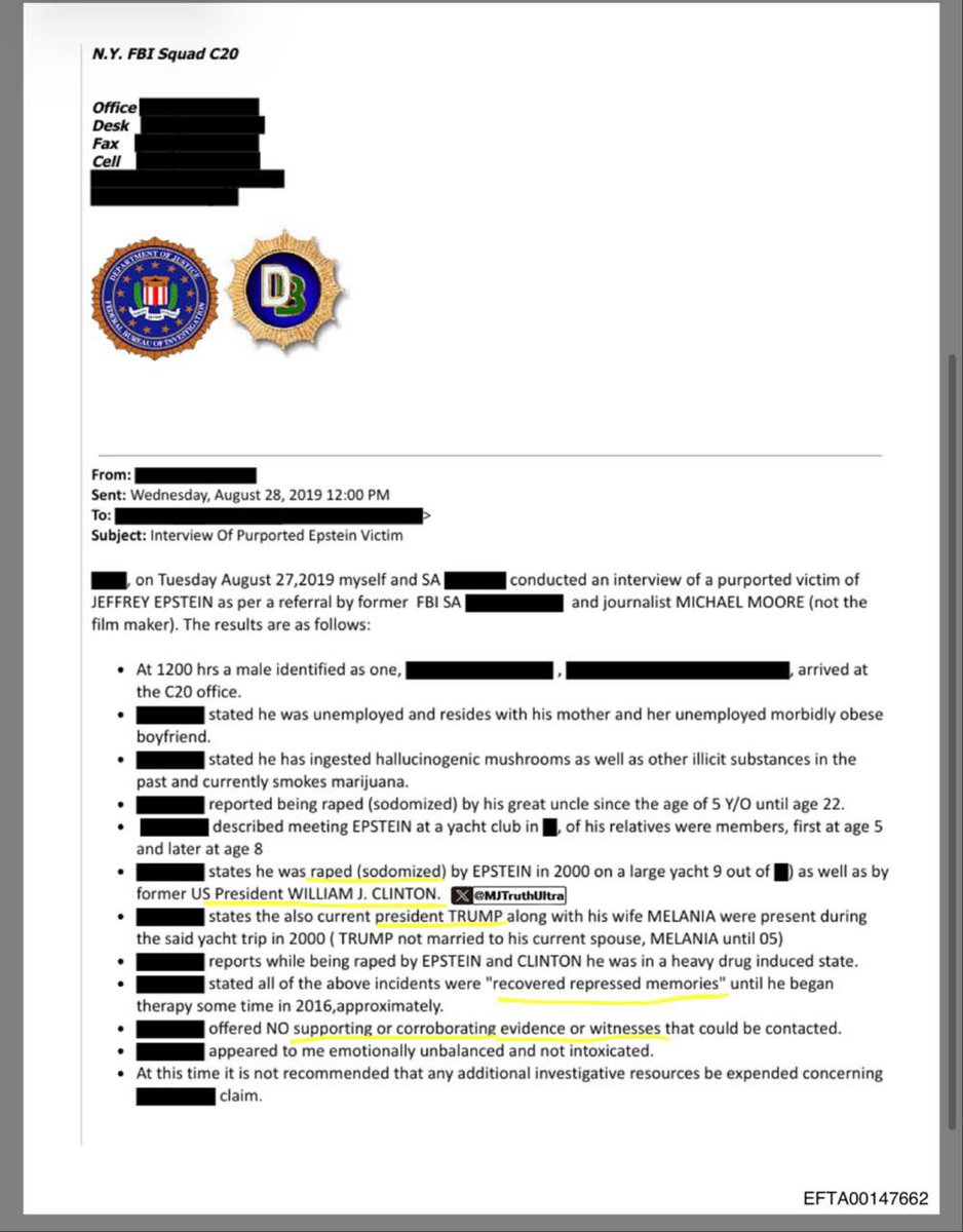 UPDATE: Epstein Files Unemployed Drug Addict Referred by True Pundit’s Michael Moore Alleges Bush Sr. & Bill Clinton Raped Him on Epstein Yacht While Trump & Melania Watched Baby Dismemberment & Feces-Eating Satanic Ritual Michael Moore should say it all.. meh. • The claimed he was raped by George Bush Sr. and Bill Clinton on Epstein Yacht – Says Trump & Melania Were Present Watching Infant Sacrifice and Intestine Feces Consumption • Ultimately, The Tip was Dismissed by FBI/NYPD 🔻 But here's where it falls apart fast: —— No evidence whatsoever: Zero witnesses, documents, photos, flight logs, yacht records, or third-party corroboration. The man offered nothing the agents could follow up on. —— Heavy drug history: Past hallucinogenic mushrooms + other illicit substances; still smoking marijuana regularly at time of interview. Claims occurred during a self-described "heavy drug-induced state." —— Repressed memories recovered in therapy: Classic red flag for unreliable recall — especially extreme, graphic details surfacing years later without prior disclosure. —— Agents described him as "emotionally unbalanced" —— Trump/Melania, were reportedly dating on and off… married in 2005, makes their joint presence on a 2000 yacht trip already questionable. —— FBI/NYPD conclusion: Explicit recommendation — "not recommended that any additional investigative resources be expended." They closed it as non-credible within days. —— Finally, again, he was referred by Michael Moore. Yikes… The entire point I think was to get his allegations documented… it’s important to understand where these allegations come from.
