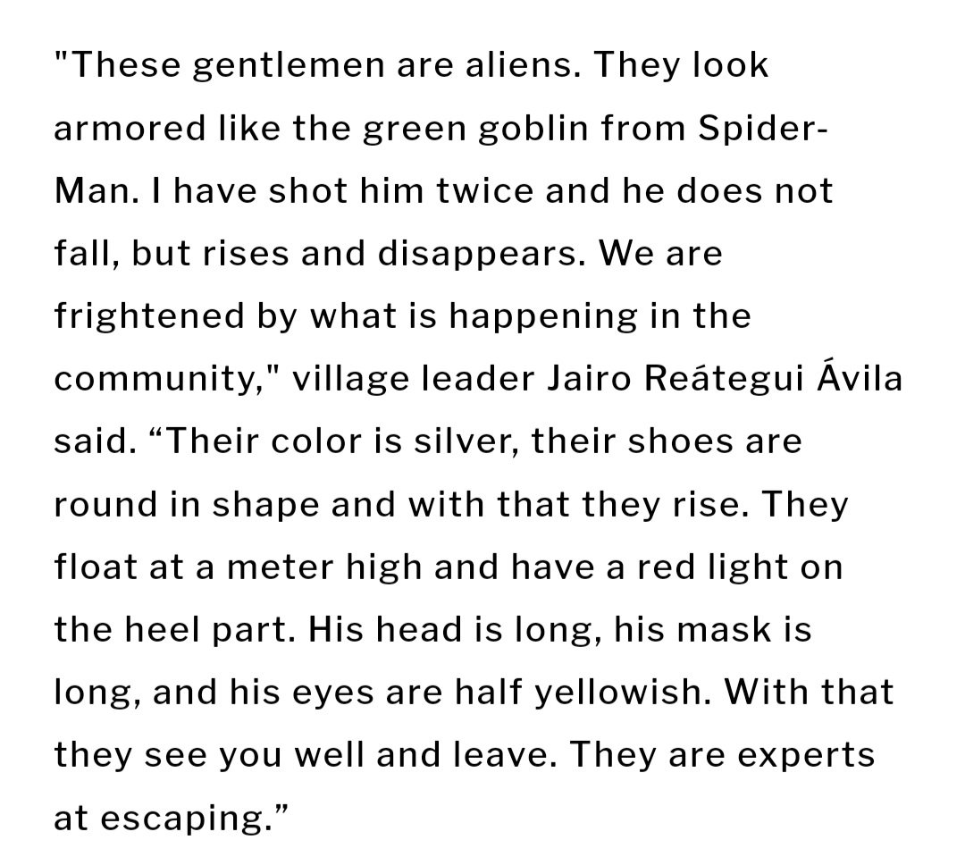 👍@iontecs_pemf This is happening all over the world. The Village people. Let me guess you want video footage? Well these people were to busy shooting back to start recording. Read the report. https://singularfortean.com/news/2023/8/7/peruvian-villagers-report-violent-encounters-with-flying-armored-silver-aliens