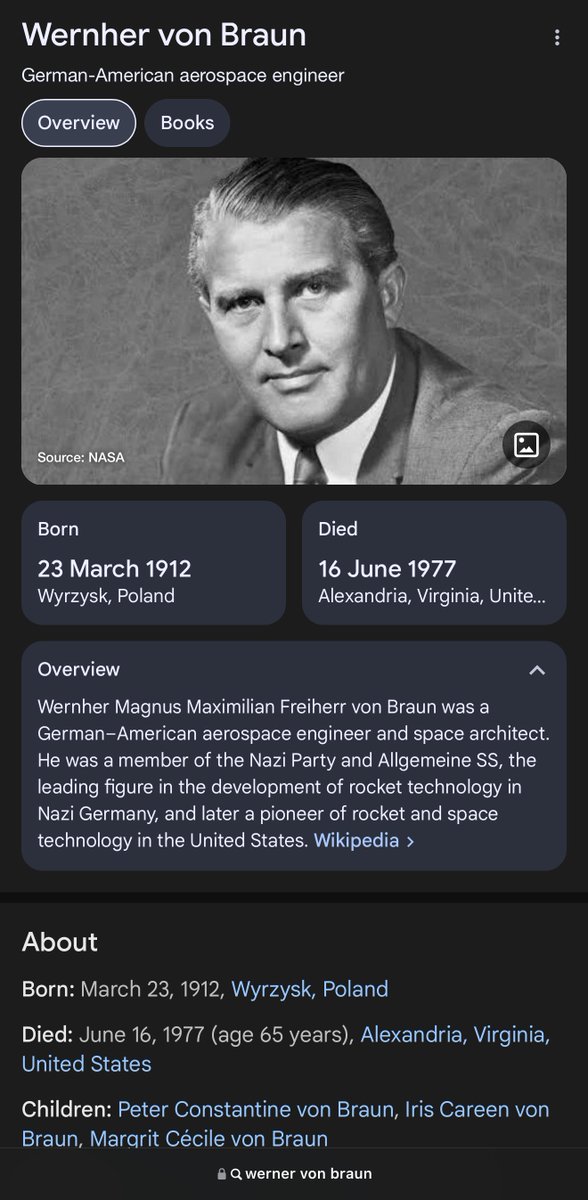 *WERNHER VON BRAUN* I grew up just outside Huntsville, AL and spent tons of time at the Wernher Von Braun Civic Center as a kid. Needless to say, I remember being devastated when I found out that WVB was an Operation Paperclip transplant from Nazi Germany. Now we know Von Braun was a regular White guy who was lead rocket scientist for “NAZI” Germany, later helped the United States take down the Soviet (Bolshevik) Union and his father was a Lutheran, a Minister of Agriculture and Nutrition for Weimar and came to America with his son. CLIFFS: I couldn’t be prouder of WVB now.🫡 Though I will say, his doctoral advisor, Erich Schumann, was a General in the German Army, led the German Nuclear Program and literally advised Adolf Hitler to use bioweapons against the United States, which Hitler staunchly refused to do. (Classic Jews, always wanting to attack us Whites with biological weapons and whatnot. I guess some things never change.)