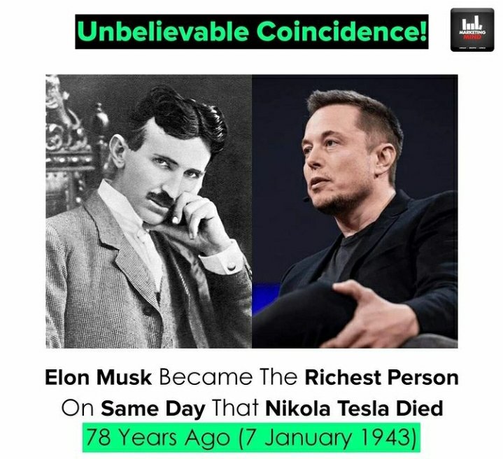 Chapter FIVE: TESLA is an Anagram for STEAL. Musk is not the "Founder" of TESLA. Musk cleverly used the "TESLA HYPER SIGIL". Names have power. TESLA is a HIGHLY Charged NAME. Exactly 78 years after Nikola Tesla died, Elon became the Richest Person on the Planet. To the DAY.