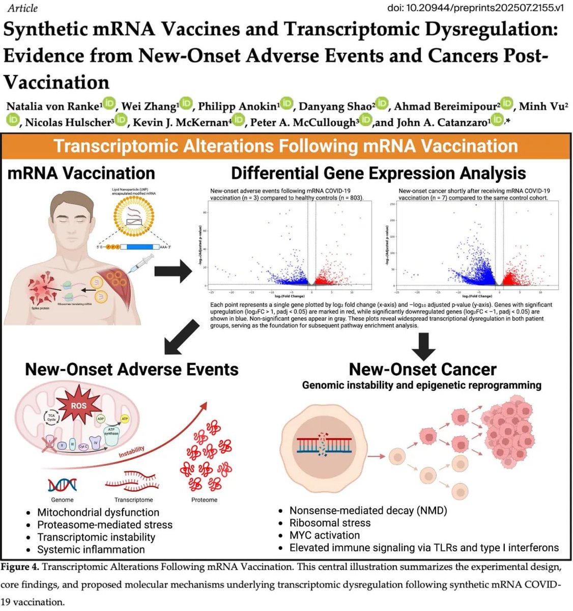 Senior HHS Advisor Dr. Steven Hatfill just said mRNA shots induce “BIOCHEMICAL HAVOC.” He’s likely referring to the new study that found mRNA shots induce severe, long-lasting genetic disruption linked to cancer and chronic disease. Using high-resolution RNA sequencing on blood samples, they discovered that COVID-19 “vaccines” SEVERELY disrupt expression of THOUSANDS of genes—triggering mitochondrial failure, immune reprogramming, and oncogenic activation that can persist for MONTHS to YEARS post-injection. Differential gene expression analysis compared mRNA-injured patients (cancer, adverse events) to 803 healthy controls — revealing widespread transcriptomic CHAOS. https://www.preprints.org/manuscript/202507.2155/v1