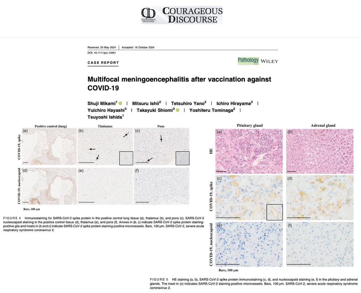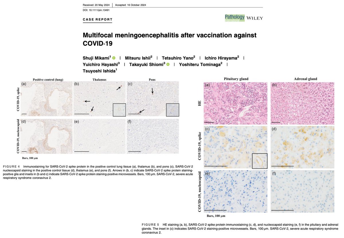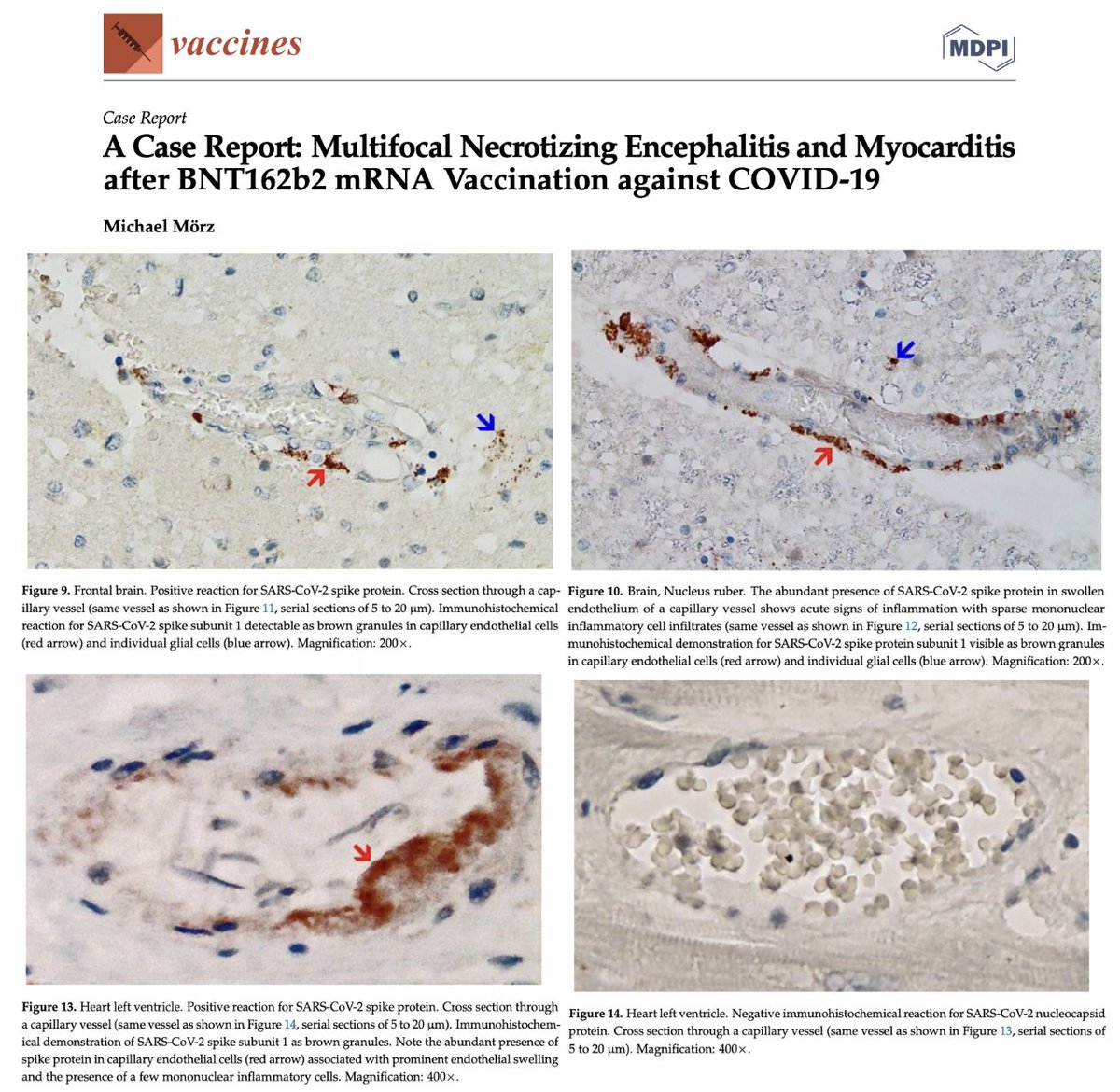Pfizer mRNA Spike Protein Found in Deceased Man’s Brain and Heart: Peer-Reviewed Report Dr. Michael Mörz from the Institute for Pathology in Dresden, Germany, published an autopsy case study of a 76-year-old deceased man in the journal Vaccines. In the report, spike proteins specifically attributed to mRNA vaccines rather than COVID-19 infection targeted blood vessels in the man’s brain and heart. Like Dr. Sucharit Bhakdi's autopsy reports, Dr. Mörz uses immune staining methods that light up specific antigens to determine that “only spike protein but no nucleocapsid protein” could be detected, meaning the death of brain tissues as well as the inflammatory changes in the brain and heart were caused by mRNA vaccination rather than viral infection. https://kanekoa.substack.com/p/pfizer-mrna-spike-protein-found-in