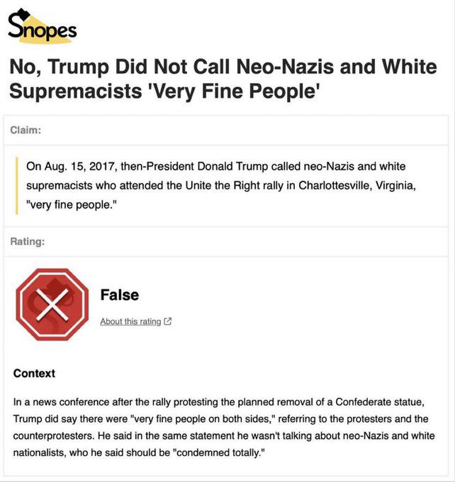 This is the full video of the “very fine people” hoax that the media doesn’t want you to see and Snopes even debunked. Biden is knowingly continuing to repeat this lie! https://t.co/2nyfUAk0LV
