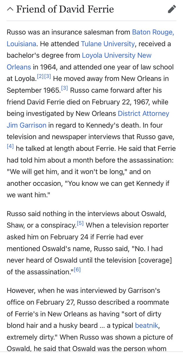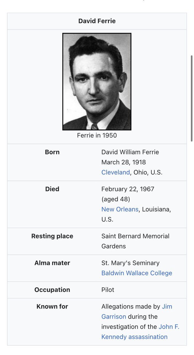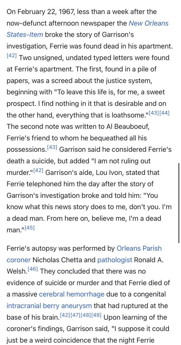 Why was Perry Russo such an all over the place witness? Well let’s start with the fact that Clay Shaw wasn’t the only person that was indicted by Jim Garrison. He implicated both David Ferrie, Clay Shaw, and William Bannister. All of them had a history of anti communist, and anti Kennedy views. Now by the time Jim Garrison indicts them (February 1967), William Bannister had already died from a heart attack years before. (He died within 1 year of the Kennedy assassination.) You will notice many untimely deaths when you dig into the JFK assassination. This leaves Jim to indict both Clay Shaw and David Ferrie. 2 days after the indictment, David Ferrie dies of a “Brain Hemorrhage.” Just a coincidence I guess. 🤷 Now to me, this really exactly explains Jim Garrisons “Star Witness” Perry Russo better than anything else. He said he came forward after the death of his friend David Ferrie. Does that make sense to you? Or did he come forward to torpedo the case with false information so he wouldn’t be killed? That seems far more plausible to me. None of his information really checked out, and he contradicted himself often. Clay Shaw was found not guilty by the jury within 1 hour of Jury deliberation 🧵 12/25