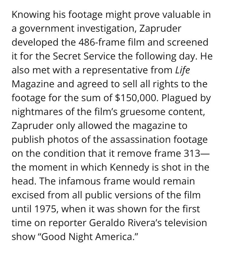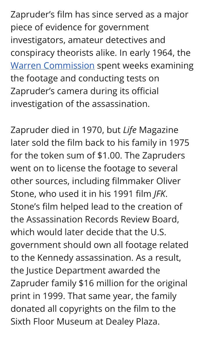 I’d like to posit a different theory about Zapruder. He knew exactly what was going to happen,along with when and where. He knew this because of his Jewish connections. His plan was to then sell this film for a large amount of money to Time/Life magazine, but his buddies in the Jewish controlled press would not release it anyway. Which is exactly what they did. Why did Time/Life pay 150k for a film they never used? Why did they sell it back the Zapruder family for 1 dollar? It doesn’t make sense if they are a for profit business… eventually the government paid the Zapruder family 16 million dollars for the film in 1999… I guess they did alright for themselves. This is why when Dan Rather describes the film in 1963, he describes it perfectly wrong to fit with the upcoming Warren Commission. They already know what needs to be said in order for it to match. He specifically says that Kennedys head flies forward because he was shot in the back of the head by Oswald. 🤥 🧵 15/25