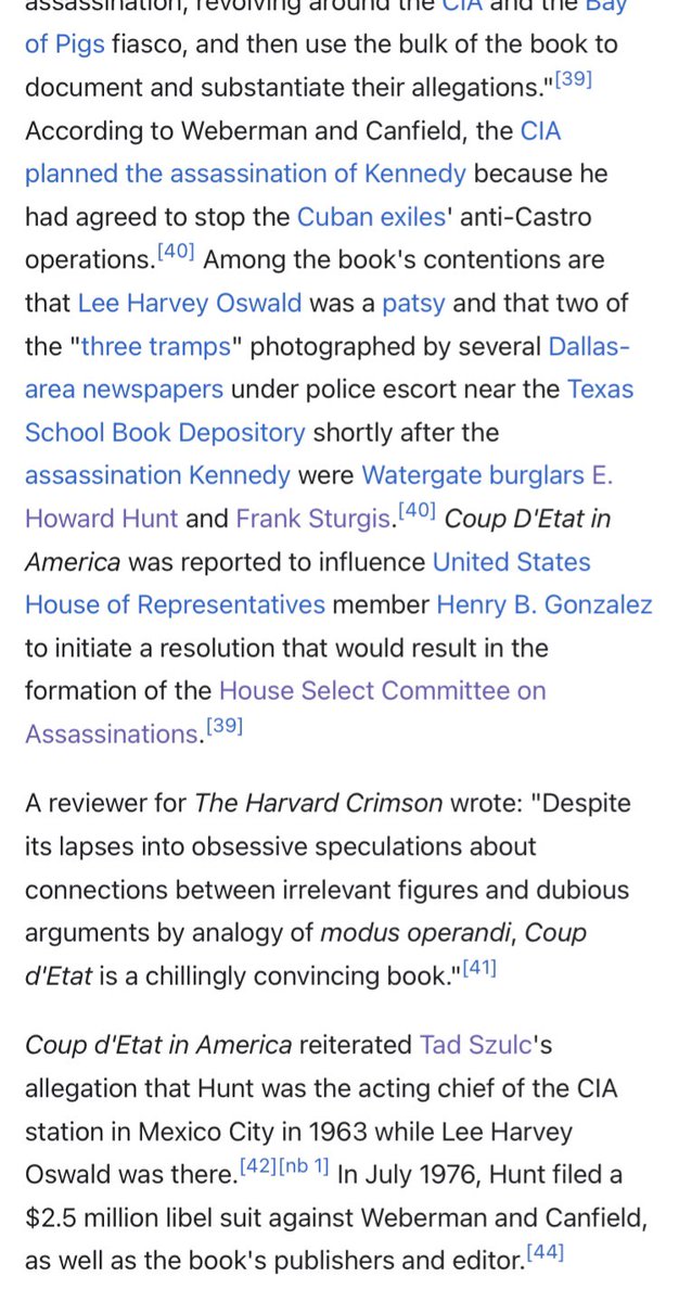 Also in 1975, Jewish ✡️ man Alan Weberman states the photo below is from the day of the Kennedy assassination, but also 2 of the men in the photo are CIA men Sturgis and Hunt. Years later this was proven to be incorrect, but the effect was still the same. They are planting in the public’s mind that if it’s not Oswald, it’s the CIA. The reason this was so important to do in the 70’s is because that’s when the Zapruder film was going to be seen by the masses. Webber also wrote a book called Coup Detat which helped push the narrative that the CIA was involved in Kennedy’s death, and amplified a fellow Jewish ✡️ man Tad Szulc’s theory that Howard Hunt was involved. Also to note Szulc, was initially the man who broke the bay of pigs story back in the 60’s. 🧐 Howard Hunt sued Webber and the book publisher for libel but dropped the case years later, citing financial reasons. 🧵 20/25