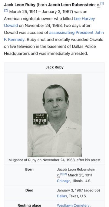Many people have spent agonizing amounts of time examining Oswald and his origins, relationships, political views etc, but unfortunately you are focusing on the wrong person. Oswald was a patsy through and through, but there was a hiccup in the operation. Oswald was not supposed to survive. Whoever had Kennedy killed also had to have Oswald Killed. Why? Because Oswald would have beat the charges with the flimsy case, and it could have also led back to who actually killed Kennedy. Who’s the clean up crew? Jewish ✡️ man Jack Rubenstein. He shot Oswald on live tv 📺2 days later when Oswald was being Transferred from City to County Jail. 🧵 3/25