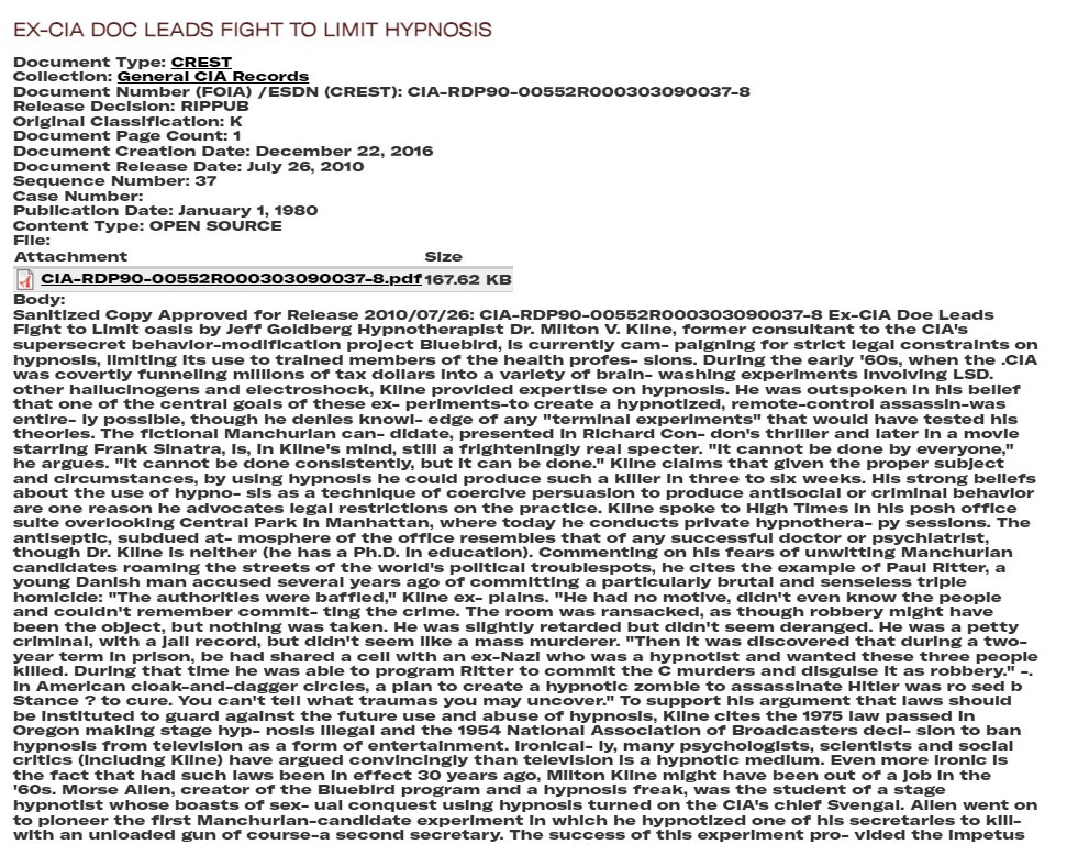 The CIA is capable of creating lone gunman in three to six weeks with a trained therapist and hypnotherapy. Dr. Milton V. Kline, former consultant to the CIA's supersecret behavior-modification project Bluebird, is currently cam- paigning for strict legal constraints on hypnosis said exactly this in a now declassified document: “He was outspoken in his belief that one of the central goals of these ex- periments-to create a hypnotized, remote-control assassin-was entire- ly possible, though he denies knowl- edge of any "terminal experiments" that would have tested his theories. The fictional Manchurian can- didate, presented in Richard Con- don's thriller and later in a movie starring Frank Sinatra, is, in Kline's mind, still a frighteningly real specter. "It cannot be done by everyone," he argues. "It cannot be done consistently, but it can be done." Kline claims that given the proper subject and circumstances, by using hypnosis he could produce such a killer in three to six weeks.” Document: https://www.cia.gov/readingroom/document/cia-rdp90-00552r000303090037-8