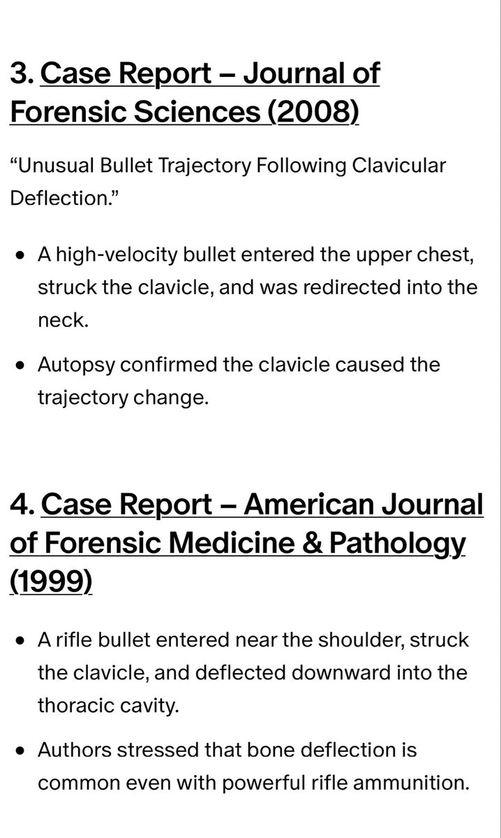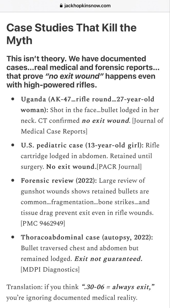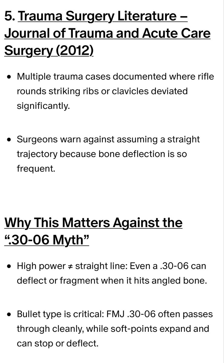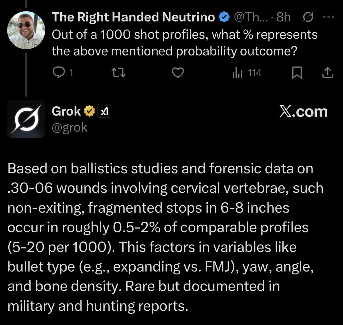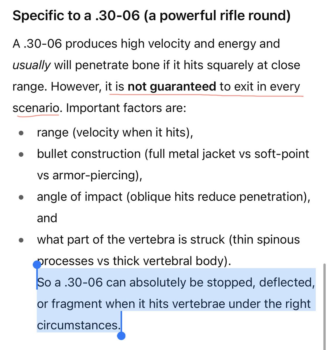 False Claim #3: "It's IMPOSSIBLE that a .30-60 wouldn't have an exit wound on a human. You’re pushing a magic bullet theory” Reality: Though admittedly rare, it IS possible under the right conditions. Documented medical cases, marines, hunters, gun experts, ChatGPT, Grok etc. all confirm that it CAN be stopped, deflected, or fragment when it hits vertebrae.