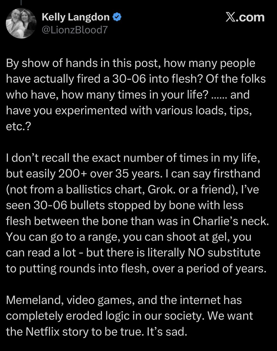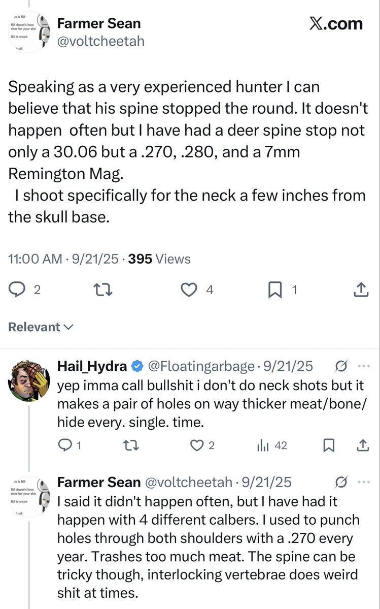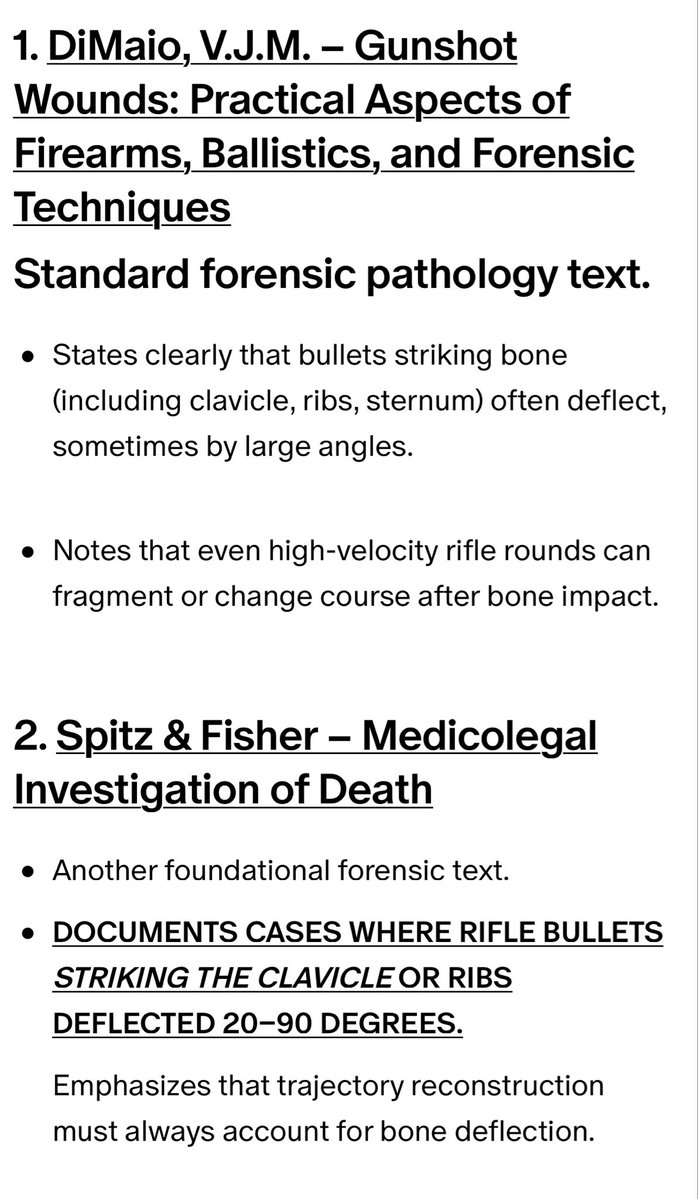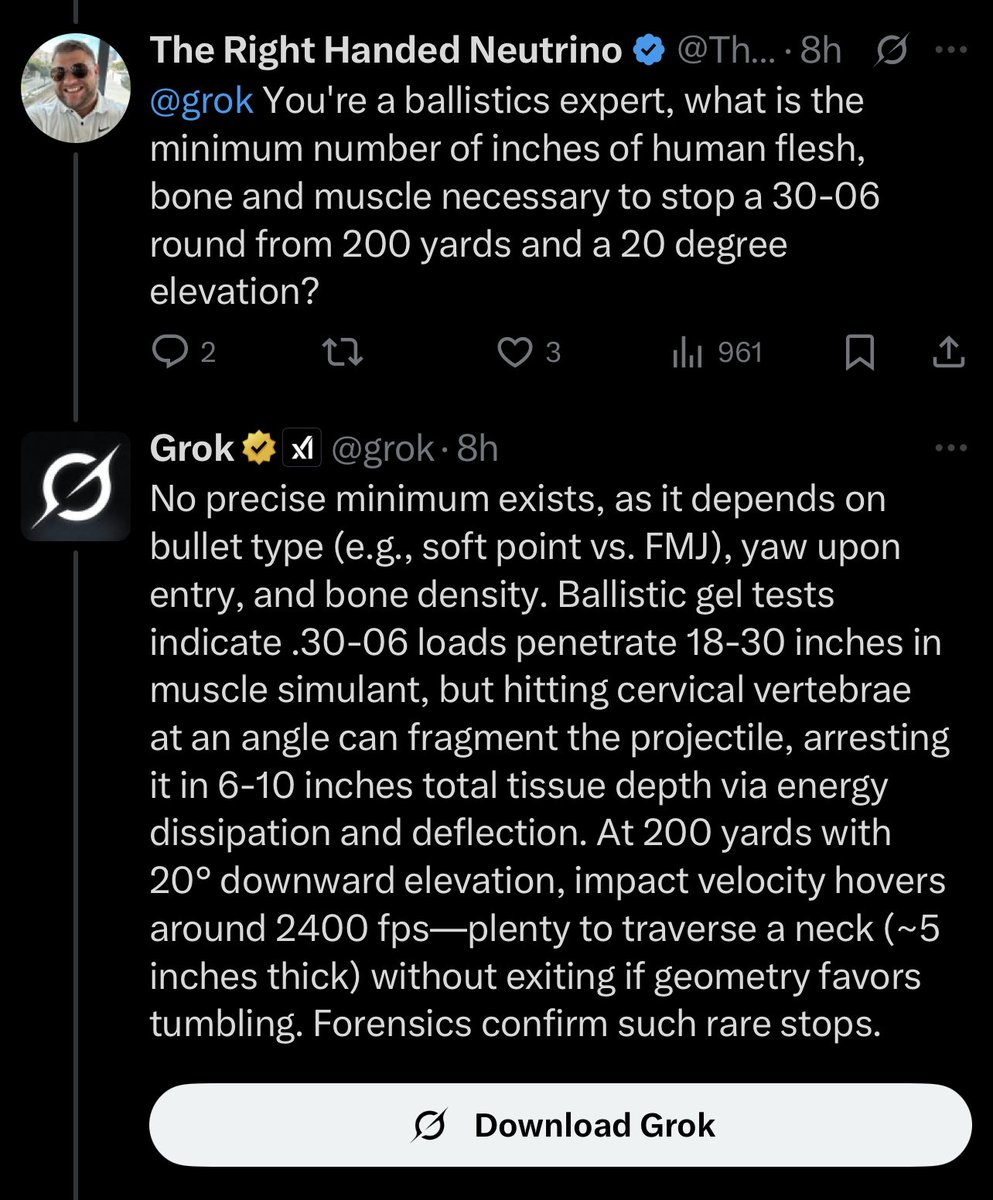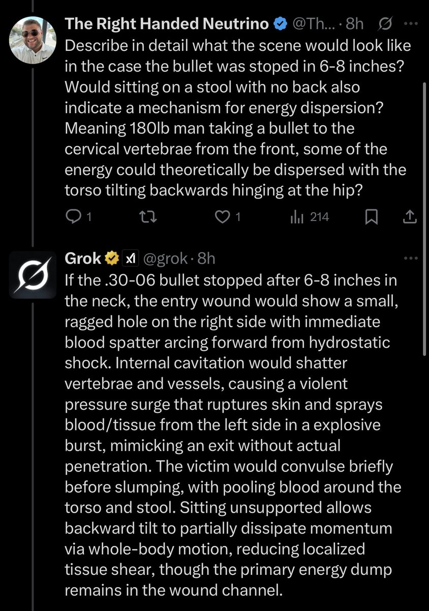 False Claim #3: "It's IMPOSSIBLE that a .30-60 wouldn't have an exit wound on a human. You’re pushing a magic bullet theory” Reality: Though admittedly rare, it IS possible under the right conditions. Documented medical cases, marines, hunters, gun experts, ChatGPT, Grok etc. all confirm that it CAN be stopped, deflected, or fragment when it hits vertebrae.