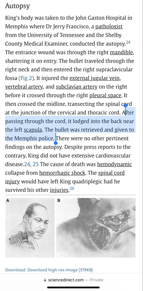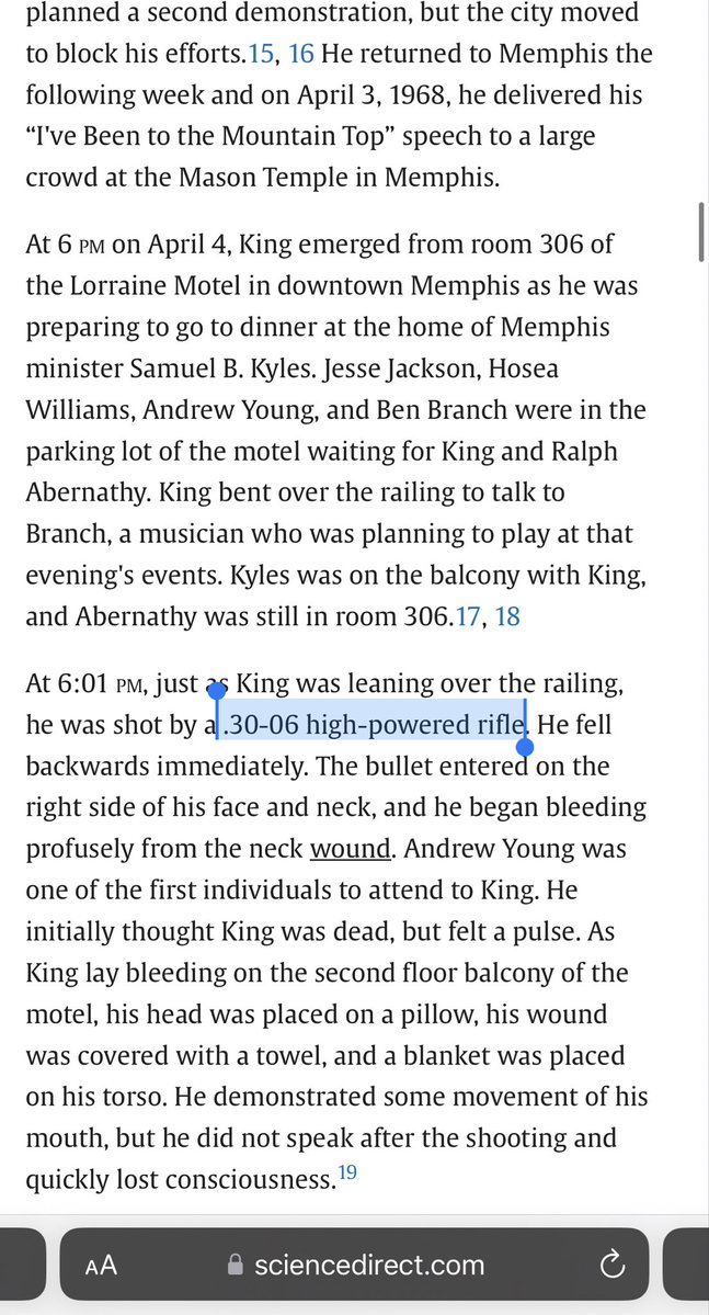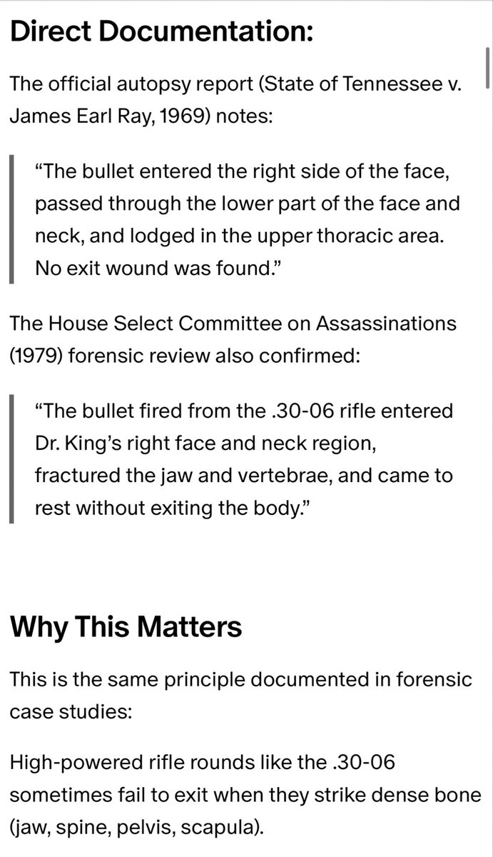 Also, MLK. The Remington .30‑06 rifle used in the assassination of Martin Luther King Jr. did not produce an exit wound — a fact confirmed by both the official autopsy and a subsequent congressional forensic review. This isn't speculation; it's documented history. If a high-powered rifle failed to cause an exit wound in one of the most scrutinized shootings in modern history, why is it so hard to believe it could happen in other cases?