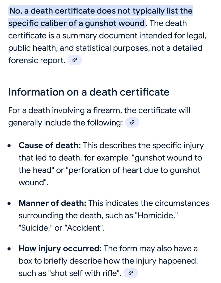 False Claim #6: “Kirk’s death certificate doesn’t mention a .30-06 round, which it should.” Reality: Death certificates typically do not specify the caliber of a gunshot wound, focusing instead on the cause of death. That’s why Kirk’s death certificate does not mention a caliber at all—not even a different one.