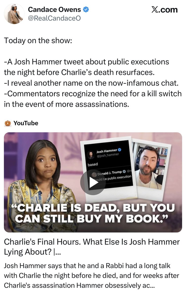 JOSH HAMMER TREACHERY? FACT: Josh Hammer randomly dug up a 12-year old Trump tweet about public executions the night before Charlie was assassinated. FACT: That same night before the assassination, Josh Hammer told us he had a meeting with Charlie wherein he claimed Charlie hadn't changed his mind on israel. He neglected to say anything about Charlie's group chat statement from the previous day. FACT: Josh Hammer was in the group chat where Charlie admitted he was going to have to abandon the pro-israel cause, yet Hammer remained completely silent about this and called Candace Owens a liar for claiming Charlie's stance on israel was shifting. FACT: Josh Hammer knew about the letter to Netanyahu, but remained quiet and let others break the story. Why is Josh Hammer calling people liars for making true claims while remaining silent on key pieces of insider information himself that refute his own claims? Watch Josh Hammer tell you about being in the group chat and tell you Charlie wasn't shifting his stance. This is now confirmed to be untrue and it turns out Candace Owens was telling the truth. Why did hammer lie about Candace and not produce this information himself?