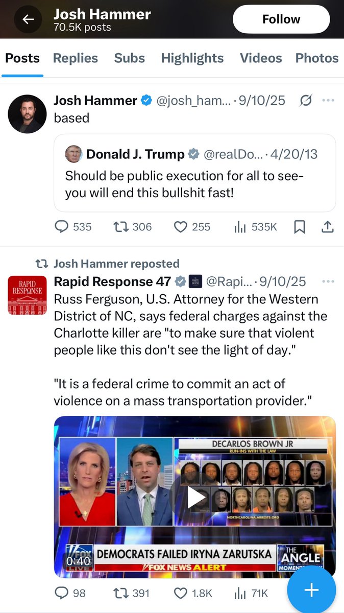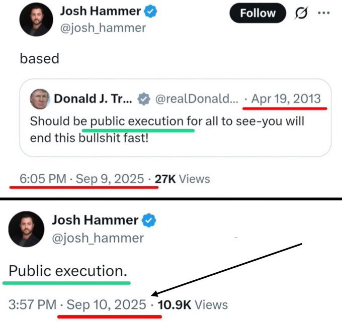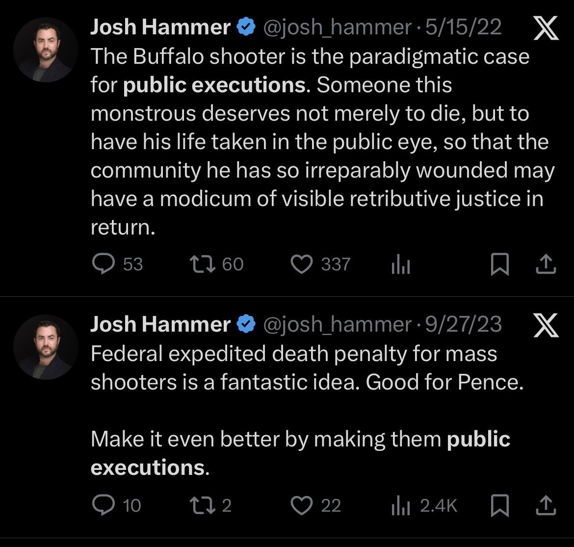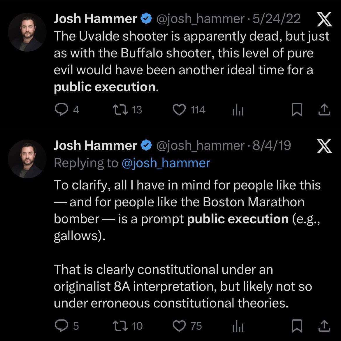 That being said, it makes perfect sense why he would tweet “public execution” on 9/10 AFTER it had just been announced by the FBI that the assassin of his dead friend was caught (though this later turned out to be the wrong suspect). Again, Josh Hammer strongly believes the assassin deserves not just the death penalty, but to be publicly executed: