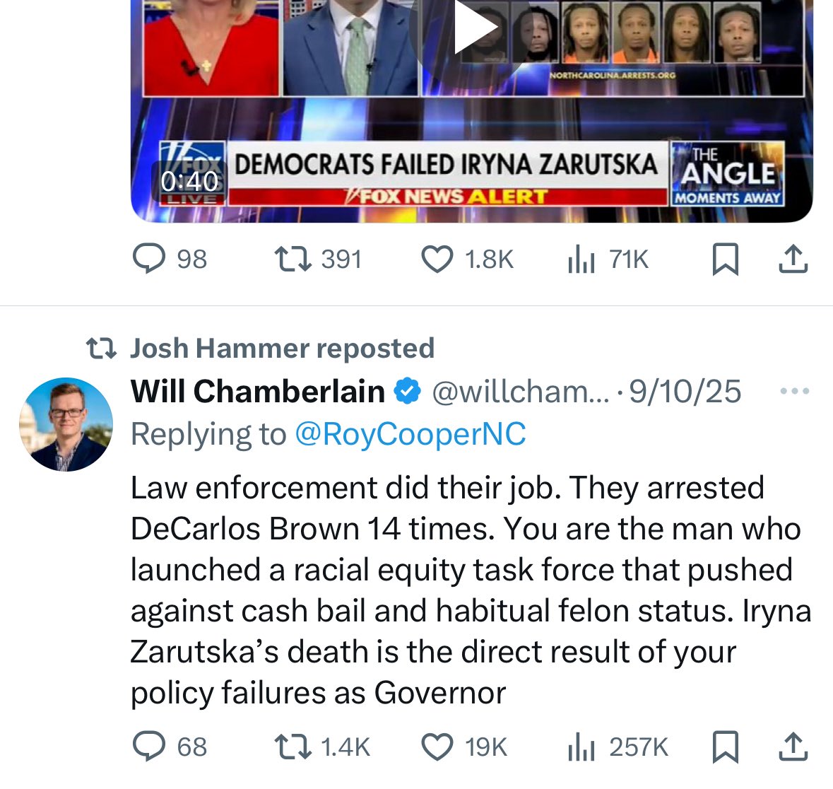 False Claim #9: "Josh Hammer was NOT referencing Iryna when he tweeted about public executions on 9/9 because it wasn't even trending" Reality: This claim, amplified by Candace Owens, is easily debunked. Iryna’s case was trending on 9/9, referenced by Charlie Kirk himself and even the White House. Thousands of tweets, including discussions on the death penalty AND public executions, circulated among major conservative X accounts. Evidence follows, starting with Owens’ false claim. This is the perfect example of the importance of not hiding behind the guise of “just asking questions” when the clear intent is to frame an INNOCENT person to your audience, leading them to the false conclusion that Hammer had foreknowledge of his friend’s murder, thereby implicating him.
