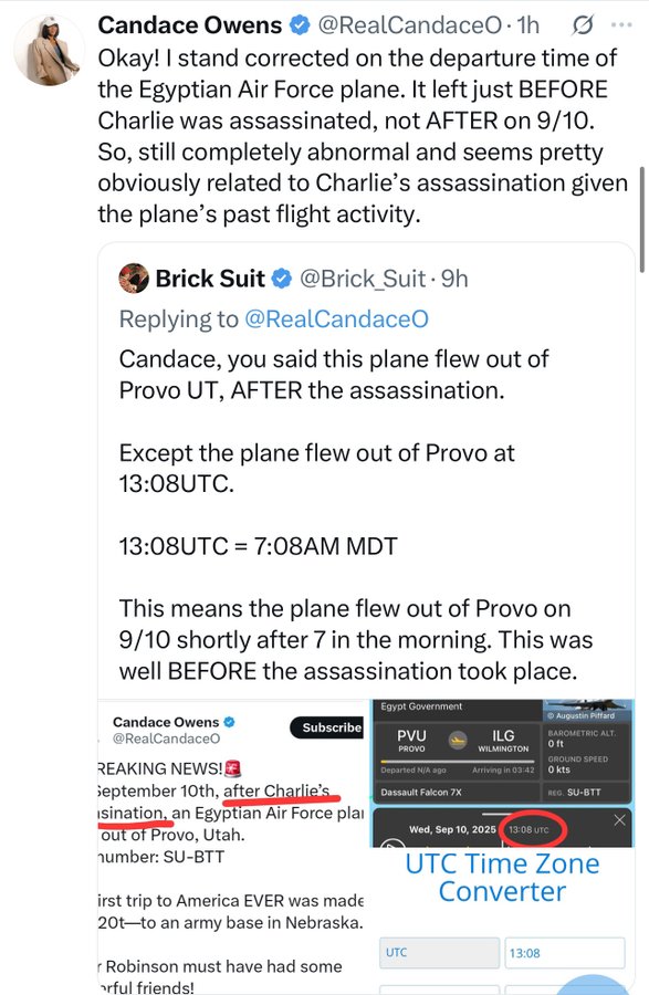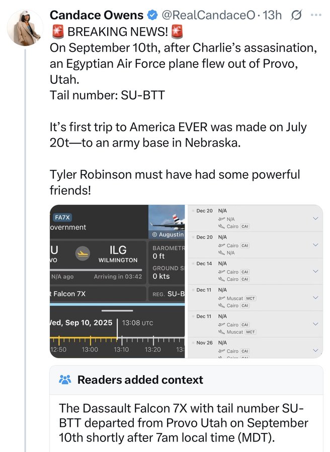 False Claim #10: An Egyptian Air Force plane departed AFTER the assassination, suggesting it was a military operation involving foreign leaders. Reality: This false claim promoted by Candace Owens appears to come from her misinterpreting "UTC" (Coordinated Universal Time) as "Utah Time." The flight in question left BEFORE Kirk's assassination took place. Though she was community noted and admits the timeline error, she still insists that it must be connected. Yet, the idea that foreign leaders would orchestrate a military operation and physically travel to the future crime scene just for a secret meeting— instead of using secure digital communication and encrypted channels like VPNs or secure video conferencing—is not only illogical but absurdly impractical in the modern era. Such a scenario would be unnecessarily risky and sloppy.