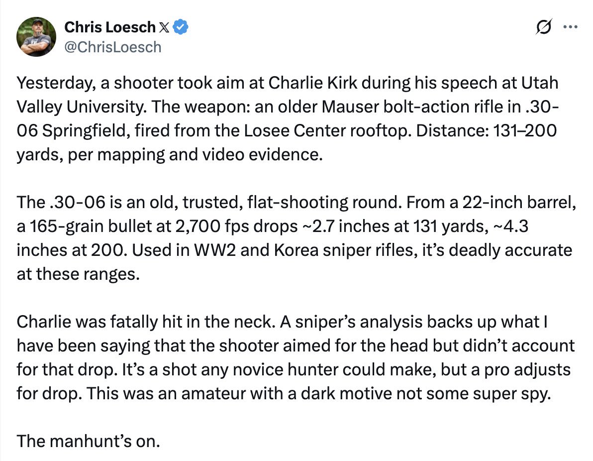 @Paranoidpropht I think Chris Martenson's analysis is the best: a rifle round from a different angle than the Tyler Robinson's position.