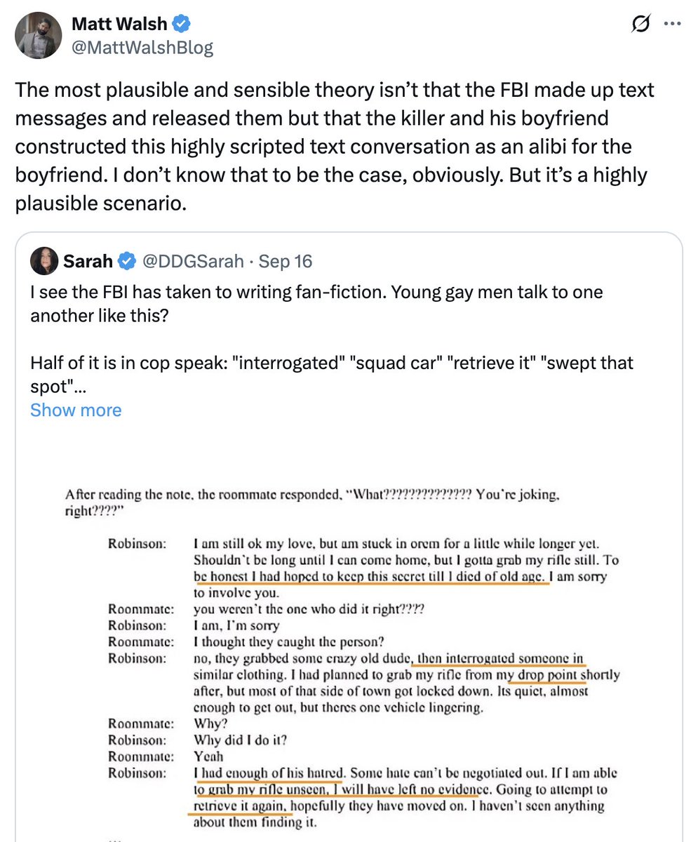 False Claim #1: Tyler Robinson's texts are fake Reality: Claims that these texts are “fake” are extremely unlikely, as they were verified for inclusion in the official charging documents. If falsified (e.g., planted or staged), Tyler’s defense attorney could simply present counter-forensic evidence, such as communication records, metadata etc. to disprove their authenticity, potentially leading to a mistrial on the grounds of fraudulent or improperly obtained evidence. Though there is still time to do this, it has already been a month with no motion to dismiss. It’s reasonable to assume that the texts are from Tyler’s phone because no counter-evidence can be presented. (Still remains plausible though to question whether Tyler orchestrated the text messages to avoid implicating others who may have been involved.)