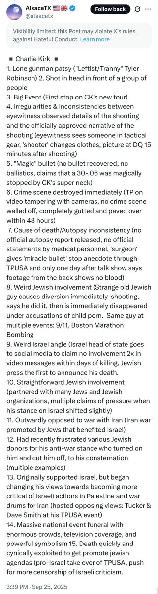 THE CHARLIE KIRK ASSASSINATION CONSPIRACIES: ARE YOU JUST SEEING THINGS? One of the reasons people suspect a conspiracy behind the assassination of Charlie Kirk—including even a possible israeli/jewish role—is because they see similarities with other high profile assassinations that involved conspiracies with israel/jewish elements, like JFK's. But until now, nobody has really systematically listed these parallels. Here's my first attempt. What parallels do you see between these and the Charlie Kirk assassination? What did I miss? Are these parallels enough to justify having these conspiracy suspicions about Charlie's assassination? Or are we just seeing things? ▪️JFK▪️ 1. Lone gunman patsy ("Communist" Lee Harvey Oswald) 2. Shot in head in front of a crowd of people 3. Big event (Trip to Dallas, Parade, etc) 4. Irregularities & inconsistencies between eyewitness observed details of the shooting and the officially approved narrative of the shooting (TSBD vs DalTex vs Grassy Knoll; kill shot from front or back?) 5. "Magic" bullet theory 6. Medical report inconsistencies & subterfuge (botched autopsy, conflicting testimony, records tampering) 7. Straightforward jewish involvement (Dallas Citizens Council, led by jews, invited JFK to Dallas) 8. Weird jewish angle (Jack Ruby murders Lee Harvey Oswald) 9. LHO left behind notorious trail of documentary evidence, some of which may have been faked 10. Wanted to end Vietnam involvement (Vietnam was a war promoted by jews that benefited israel) 11. Tried to register AIPAC (AZC) under FARA 12. Was pro-israel, but also supported Palestinian Right of Return 13. Massive national event funeral with enormous crowds, television coverage, and powerful symbolism ▪️RFK▪️ 1. Lone gunman patsy ("Terrorist" Sirhan Sirhan) 2. Shot in head in front of a crowd of people 3. Big event (Just won the California Primary at Ambassador Hotel Celebration) 4. Irregularities & inconsistencies between eyewitness observed details of the shooting and the officially approved narrative of the shooting (Sirhan's shots came from the front & several feet away, while the death shots came from behind & close up; 10-13 shots heard vs only 8 bullets in Sirhan's gun) 5. "Magic" bullets & "Magic" shot (death bullets not a ballistics match for Sirhan's gun, kill shot came from behind, not the front) 6. Crime scene destroyed (the scene was not properly sealed allowing hundreds of people to pass through; key evidence such as the pantry door frames, ceiling tiles, and wood panels with possible bullet holes were destroyed or “lost” by the LAPD) 7. Autopsy report ignored (kill shots clearly came from behind, handwaved away at trial) 8. Weird jewish involvement (Press Secretary, Frank Mankiewicz—jewish member of the ADL—diverted RFK toward the pantry contrary to the prearranged exit through the ballroom) 9. jewish press first to establish the accepted narrative: that it was a case of Palestinian terrorism & hatred of israel (Jerry Cohen, LA Times) 10. Weird documentary evidence of the crime from the patsy (notes allegedly written by Sirhan confessing his plans to assassinate RFK; notebooks of Sirhan's writings used to paint his character to the public) 11. Wanted to end the Vietnam War (Vietnam was a war promoted by jews that benefited israel) 12. Tried to register AIPAC (AZC) under FARA 13. Supported right of israel to defend itself 14. Massive national event funeral with enormous crowds, television coverage, and powerful symbolism ▪️MLK▪️ 1. Lone gunman patsy ("Racist" James Earl Ray) 2. Shot in head in front of a group of people 3. Big Event (was in Memphis to support the Black sanitation workers' strike) 4. Irregularities & inconsistencies between eyewitness observed details of the shooting and the officially approved narrative of the shooting (some eyewitnesses say they heard shots from nearby bushes rather than the alleged boarding house) 5. "Magic" bullet (the fatal bullet failed the ballistics match to the rifle that was allegedly Ray's) 6. Crime scene destroyed immediately (within hours & into the next day, city workers cut down and cleared the brush where eyewitnesses placed a possible shooter, erasing any chance of testing whether a second shooter had been hidden there; bloody towels cleaned up; balcony not secured) 7. Cause of death/Autopsy inconsistency (multiple witnesses claim MLK was murdered while still alive at the hospital) 8. Weird jewish involvement (Ray's handler was a shadowy figure named Raul who was a known associate of Jack Ruby; Ray visited a jewish plastic surgeon the month before the assassination) 9. Weird israel angle (Ray assumed the identity of Eric Galt, the manager of a Union Carbide plant that manufactured bomb triggers for israel) 10. Straightforward jewish involvement (partnered with many jews and jewish organizations) 11. Wanted to end the Vietnam War (Vietnam was a war promoted by jews that benefited israel) 12. Had recently frustrated various jewish donors for his anti-war stance who turned on him and cut him off, to his consternation 13. Originally supported israel & scheduled a trip to visit, but then canceled it and began changing his views towards becoming more pro-Palestine 14. Massive national event funeral with enormous crowds, television coverage, and powerful symbolism 15. Death quickly and cynically exploited to get new laws passed that favored jewish agendas List the parallels you see to Charlie's assassination in the comments below. Let's crowd source.