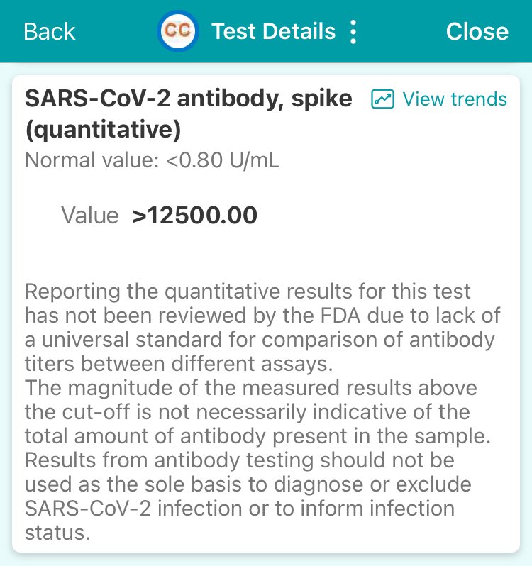My own anti-spike antibodies immediately following my Feb 2023 acute infection were off the charts - >12,500 U/mL. Compare this to Oct 2021 when I'd only been vaccinated - they were 2000 U/mL. 4/