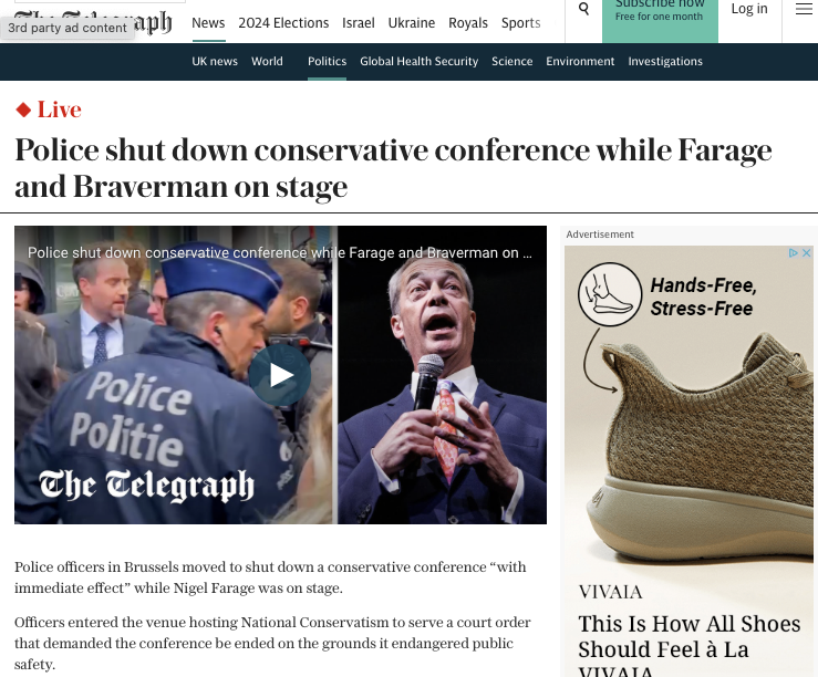 This is outrageous totalitarianism and must be condemned by all Western political leaders, no matter where you sit on the political spectrum. Police officers in Brussels shut down a conservative political gathering while former UK politician @Nigel_Farage was on stage. This is the kind of thuggish gangsterism that we rightly associate with Nazism and Communism. Shame on the police and mayor of Brussels for this totalitarian tactic! "The police document," reports The Telegraph, "suggested speeches by speakers including Nigel Farage and Suella Braverman could lead to public disorder or display racist and homophobic views." Apparently, the police have, for now, allowed the conference to go on. But they have blocked any new people from entering.