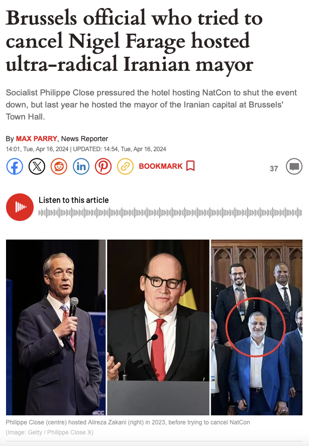 THE STORY GETS EVEN CRAZIER!!! The Mayor of the City of Brussels, who just blocked access to a gathering of European conservatives hosted a radical Islamicist Iranian mayor last year! "Tehran mayor Alireza Zakani was placed under sanctions by the UK in 2023 on the grounds that he had been 'involved in the commission of serious human rights violations or abuses in Iran.' He was also reportedly an Iranian paramilitary prior to becoming the capital city's mayor." https://www.express.co.uk/news/politics/1888954/natcon-shut-down-brussels-mayor-iran