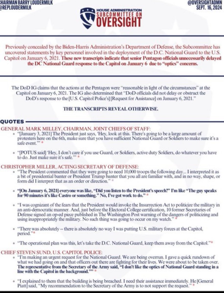 🧵Chairman @RepLoudermilk revealed last week that days before January 6, 2021, President Trump met with senior Pentagon leaders urging them to do their jobs to protect lives and property. The transcripts released show Trump gave senior Pentagon leadership directives to keep January 6 peaceful - including using the National Guard: