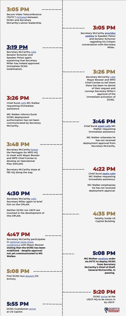 In these vital hours, the DCNG has been trying, but unable, to reach Secretary McCarthy. DCNG Adjutant General Aaron Dean: “[Walker] tried to call Secretary McCarthy three times between 2:30 and 5pm. He said, ‘I haven’t heard from him all day.’ When he tried to call his cell phone, it went straight to voicemail.” https://cha.house.gov/_cache/files/c/b/cb7fd7af-427f-4e29-b6ad-be2f548091b5/F9037FF312C5418C14B79216AB62002A.aaron-dean-ti-redacted.pdf