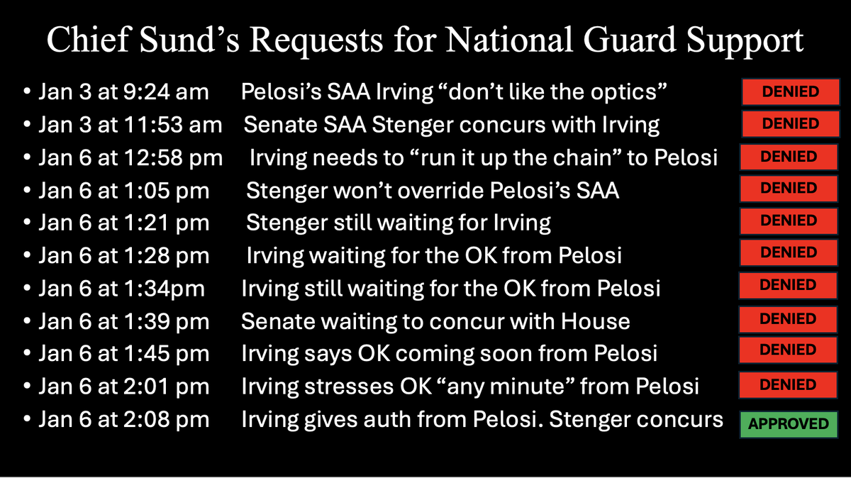 FACT: I made 11 urgent calls requesting National Guard support on Jan 6, starting at 12:58 PM. Approval was withheld for 71 minutes by the House Sergeant at Arms, who reported directly to Speaker Pelosi. She caused critical delays, and now is shifting blame to @realDonaldTrump for failures she helped create. The record is clear.