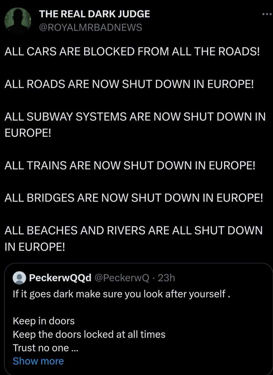 For The NPC's: Flight Or Fight Original Post- Not my info. Not my intel. Not my post. Now with that said I shared this given the power & influence of "The Judges" and their connections to all world leaders and militaries on an international basis. I have every reason in the world to trust them. Why? Because they are the reason accounts like mine can exist on Twitter/X. How? Because they have direct access to the servers on both Gab and this platform. This post was for "The Deep State". Land (Cars & Motorcycles) ❌️ Air (Planes & Helicopters) ❌️ Sea (Boats & Submarines) ❌️ No escape. ~The Olu