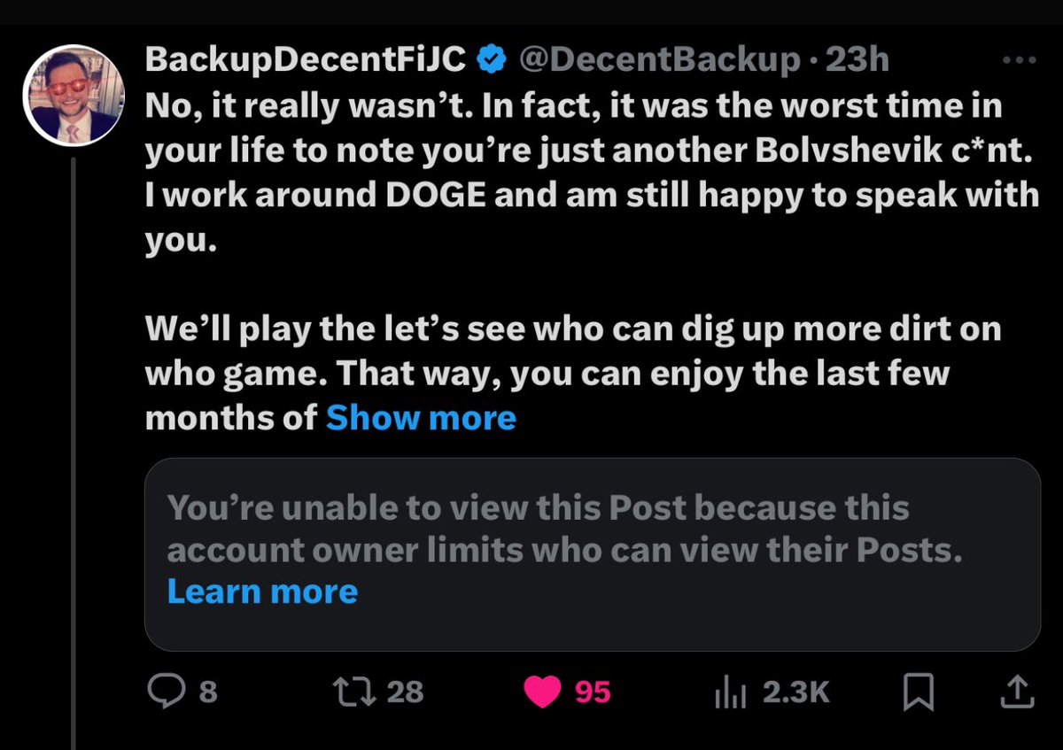Dmitry, In your frantic efforts to get me suspended (again), you didn’t even take a second to consider you’d just nuked all your homies alongside you by confirming our intel… …instead of just taking the massive fucking L. Now, your only move is “that’s not me”, hours after the fact, because the BolshevikHQ war-gaming fa***ts determined the only GTO play that MAYBE spares them now is you retroactively convincing everyone you’re just some low-rent Mossad/CIA anon retard who tags Elon fucking Musk on the false doxxing claims he makes. I mean, clearly, you’re all of those things too, but you (and they) are completely fucked. Best of luck with the sales pitch, cunt.🤣