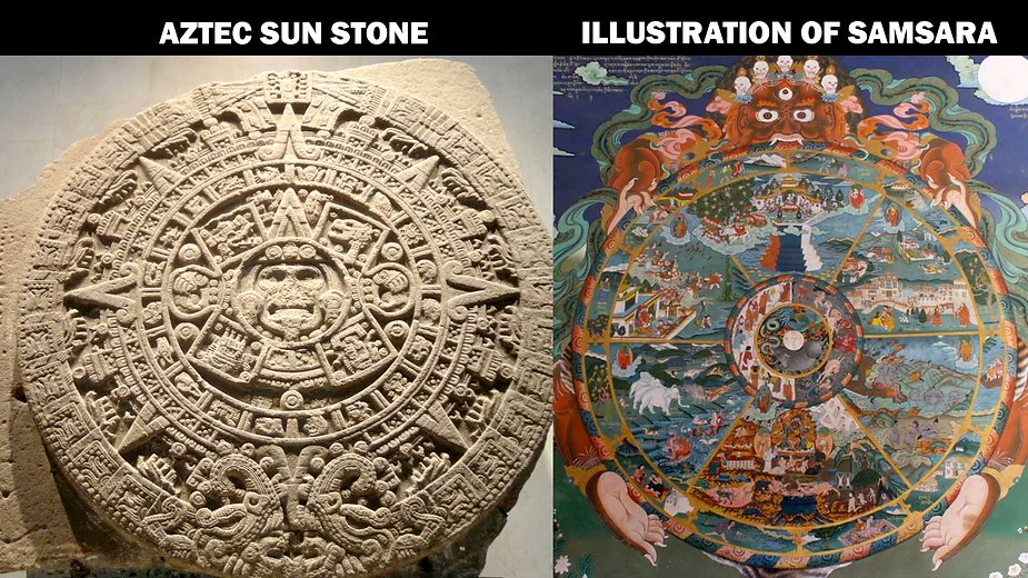The concept of humans living in the simulation is ancient. Many people think it is derived from the movie Matrix. Yesterday, I covered the Gnostic concept, and today we'll go even further back from Asia to Mesoamerica. The concept of the Gnostic illusion created by Yaldabaoth can be found in older religions. In this post, I will present the materialistic illusion known as Maya from Hinduism and Buddhism. While their viewpoint is not as extreme as the Gnostic perspective, we can observe that the illusion, or in contemporary terms, the simulation, is real, and the ultimate goal should be to escape from it. Samsara refers to the cycle of birth, death, and rebirth in Hinduism, Buddhism, and Jainism. It is best represented through the Bhavachakra wheel or the wheel of life in the Tibetan tradition. Maya is the concept of illusion or the deceptive nature of reality. It suggests that the world as we perceive it is not the ultimate reality but rather a distorted and illusory representation. Maya is the illusion that perpetuates the cycle of Samsara by causing individuals to become attached to the transient and unreal aspects of the material world. Samsara is considered a consequence of Maya. The soul, influenced by ignorance (avidya), becomes attached to the material world due to the deceptive nature of Maya. Maya makes individuals perceive the world as real and attaches them to the transient aspects of existence, such as wealth, relationships, and worldly achievements. So, we can see here that desire, ego, and emotions, which in my opinion constitute the artificial spirit, blind the individual, preventing them from focusing on important matters and perpetuating a life of ignorant bliss. These emotions are feed by the Demiurge and the Archons in the Gnostic teachings in order to keep us spiritually deprived and unable to find the inner light. But now letโs see the symbolism presented in the Bavachakraโฆ At the center of the wheel, we can see the three poisons of ignorance, aversion, and attachment represented by the pig, the bird, and the snake. According to the ancient rule of the Bhavachakra wheel, Buddha should also be depicted at the center with the three poisons in front of him. However, more often, Buddha is represented outside the wheel to symbolize salvation. In my opinion, both interpretations are correct, but depicting Buddha in the center makes sense when we view the representation through a different lens. The three poisons of ignorance, aversion, and attachment find representation in the pig, symbolizing the materialistic world. From these poisons arise factors such as ignorance, ego, desire, hate, delusion, confusion, greed, lust, etc., which keep sentient beings trapped in samsara. The snake represents spiritual enlightenment or the elevation of the spirit towards the light, perceiving the true reality, removing the veil, and facilitating the evolution of the soul. Similarly, the bird, as seen in various religions, symbolizes complete enlightenment and salvation. Thatโs why every major deity in Hinduism is represented with a snake. We can observe a similar pattern in Egyptian mythology, where each deity is depicted with the Sun above their head and a snake. Additionally, the primary deity, like Horus, is represented as a bird. For further clarification, please read my extended thread on X. The Inca trilogy shares a similarity with this representation: instead of the pig/boar symbolizing the materialistic world, the Puma takes on that role. The Snake represents the link between the materialistic world and the upper world, and the bird (Condor) signifies the upper world. Every religion is connected and derives from the 'Primordial Tradition' of the antediluvian civilization; we were once unified. Thatโs why, in my opinion, the Aztec Sun Stone has the same meaning as the Bhavachakra. I explore this connection in detail in the video linked in the comments. Sun gods represent enlightenment, and through the light is the only way out from the materialistic trap. So, in the middle of the Aztec Sun Stone, there is either an enlightened deity, something similar to Buddha, or itโs the one that is in charge of this illusion, something like the Demiurge or the demon in the Bhavachakra that is depicted on the top of the wheel. In the later editions of the Bhavachakra, the demon is the god Yama, who indeed is the main god of Samsara. Moving on to the two half circles around the center, they represent the good and the bad Karma in the cyclical illusion. Next are the realms of existence; the lower three levels consist of hell in the middle, the animal and ghost kingdoms, and above them are the realm of humans and the realm of the Gods or the Devas. The realm of the Gods is sometimes depicted as two separate segments, one for the Devas and another for the Asuras, the evil entities. The realm of the Asuras lacks the ability for enlightenment and escaping the cyclical nature and the trap. Even in the illusion, there are higher and more powerful forms than us. In my opinion, that is the realm of the more evolved spirits that were worshipped as Gods in the past or were summoned to make a 'deal with the devil.' In the Gnostic version, the king of the illusion is the Demiurge. In the Bavachakra wheel, it's the demon of Impermanence, and later, it's the God Yama. In my opinion, as I mentioned in Hinduism and Buddhism, the Samsara is portrayed with respect, unlike the pure evil depiction in Gnostic teachings. This is intentional because they are powerful spirits who can cause real harm to the disobedient, but the ultimate goal should always be the escape. Outside the realms of existence lies the final ring, adorned with the twelve links of dependent origination. Commencing with ignorance, it is symbolized here by a blind person navigating with a walking stick. The Tibetan traditions state that the creature in charge of Samsara is the demon of impermanence, not Yama, although some claim it to be