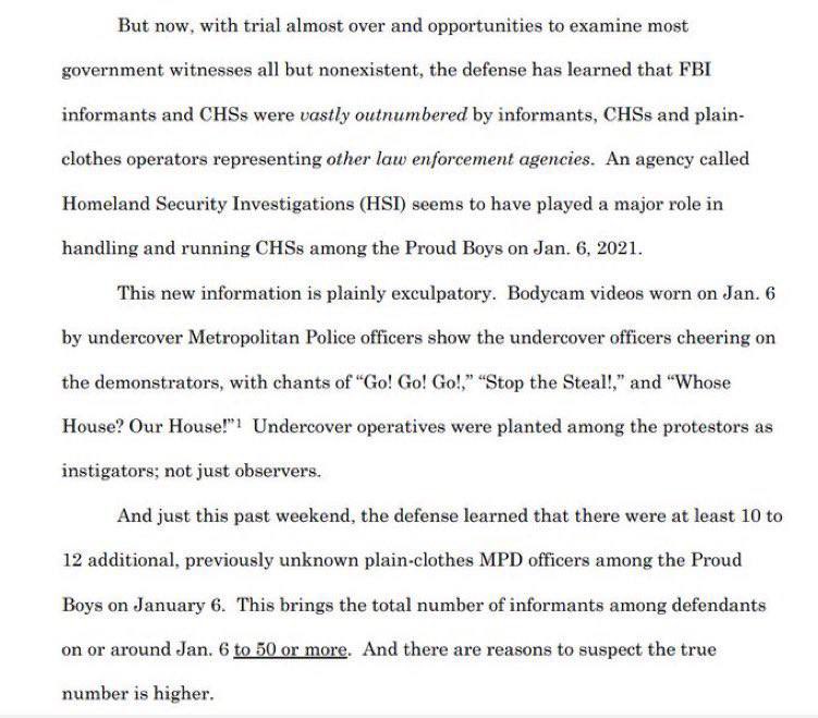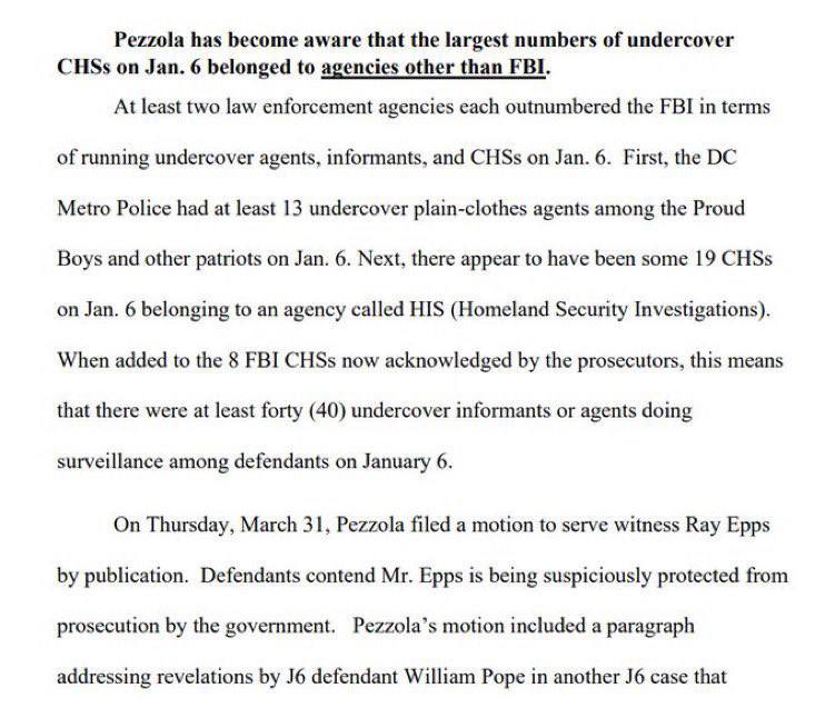 We also now know there was an FBI presence on January 6— Hundreds of agents in the crowd when at first they said there was little to no FBI presence How many of these agents played a role in instigating or steering violence? It was later discovered that Internal FBI Communications in the United States v Ethan Nordean case revealed the FBI Demanded the Removal of Agent Participation & Were Found to be DESTROYING EVIDENCE! This not only proves the FBI lied on the stand, but there were criminal informants involved who sought to have their records altered to conceal their involvement! This may be a Brady violation! Brady Disclosure: “The rule requires that the prosecution must turn over all exculpatory evidence to the defendant in a criminal case. Exculpatory evidence is evidence that might exonerate the defendant.” This Video https://rumble.com/v2cj02o-january-6-internal-fbi-communications-reveal-the-fbi-demanded-the-removal-o.html United States https://www.documentcloud.org/documents/23699546-nordean-filing-on-fbi-testimony In addition, a motion filed by a J6’er Pezzola’s attorney, Roger Root, the FBI Admitted to having 40 Undercover Agents (that we know of) Infiltrated the Crowds on Jan. 6 The DOJ admitted that of the 13 Proud Boys involved with J6, eight or more of them were paid by the FBI to provide the government information about the group. The Proud Boys were outnumbered 10-1 by undercover gov’t agents and informants at the Capitol Article https://www.thegatewaypundit.com/2023/04/shocking-update-fbi-now-admits-40-undercover-agents-infiltrated-the-crowds-on-jan-6-fedsurrection/?utm_source=rss&utm_medium=rss&utm_campaign=shocking-update-fbi-now-admits-40-undercover-agents-infiltrated-the-crowds-on-jan-6-fedsurrection
