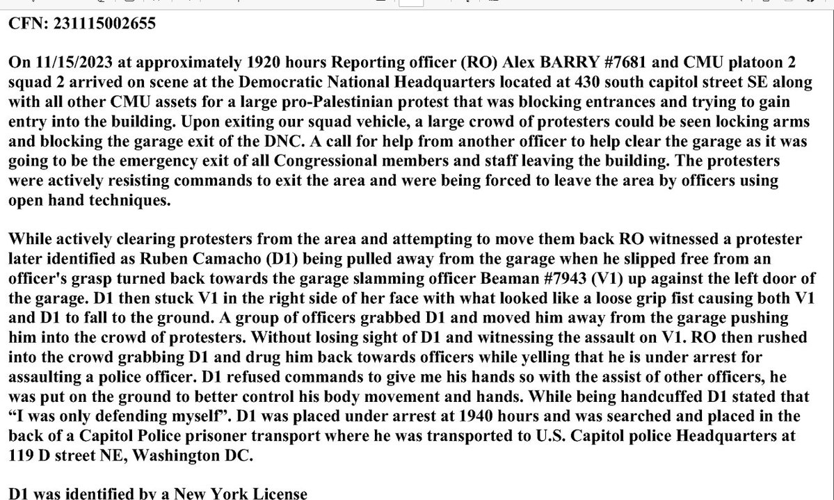 This will certainly outrage many J6ers and their families. A NY man was arrested last November for assaulting 2 Capitol police officers during a pro-Hamas demonstration outside the DNC. (V1 here is a female officer according to a Capitol Police press release.) Ruben Camacho also resisted arrest and blocked an exit used by federal lawmakers. Here is the incident report. But unlike J6ers accused of assaulting police...