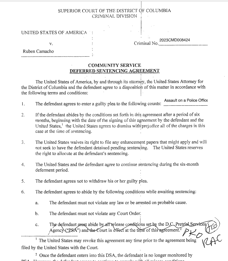 Camacho was not charged in federal court--he was charged in DC (local) Superior Court by DC US Attorney Matthew Graves, the same Biden appointed prosecutor continuing to arrest and charge J6ers with assault on federal officers. Camacho did not have to face Judge Beryl Howell or Judge Tim Kelly or Judge Royce Lamberth in the DC federal courthouse. Camacho was not denied release from jail pending trial or plea; he was not condemned as an "insurrectionist" or "domestic terrorist" by federal prosecutors. No, because Camacho participated in a protest sanctioned and funded by Democrats, he got a slap on the wrist:
