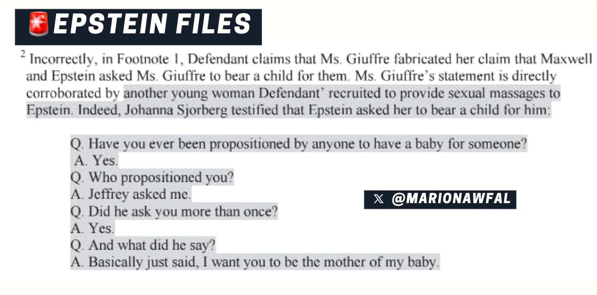 🚨 EPSTEIN ASKED ABUSED GIRL TO BEAR CHILD Ms Giuffre, the victim who allegedly was raped by Prince Andrew, was repeatedly told by Epstein to get pregnant. Source: Epstein files https://t.co/YkBL2pq7LL