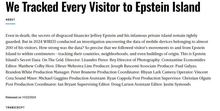 Even in death, the secrets of Jeffrey Epstein remain tightly guarded, but earlier this year I spearheaded a WIRED investigation that uncovered the data of almost 200 mobile phones belonging to visitors- [camera shutter clicking] To his infamous pedophile island. The data was so precise we were able to map the paths of these visitors to within centimeters, including their neighborhoods, buildings of origins, and the paths they took to get to the island. These digital trails document the numerous trips of wealthy and influential individuals seemingly undeterred by Epstein's status as a convicted sex offender. WIRED's analysis of the data is ongoing and it raises profound questions about privacy and surveillance. This is Epstein Island's Secret Data, On The Grid. This is Little St. James, AKA, Epstein Island. These red dots on the map represent some of the 11,279 coordinates I obtained. They were left exposed online by a location data broker with ties to the Defense Department called, Near Intelligence, now known as Azira. Between 2016, and Epstein's final arrest in 2019, Near collected data on more than 200 cell phones that visited the island. We don't know why they did that, or which client, or prospective client of Near, decided to query the data in this way to produce the maps. But the maps you'll see in this video show where visitors- [camera shutter clicking] To Epstein Island spent most of their time. Let's take a step back. You might be wondering where is Epstein Island anyways, well, it's here. Little St. James is a private island that is part of the U.S. Virgin Islands, an unincorporated territory of the United States in the Caribbean Sea. Epstein purchased little St. James in 1998 for $7.95 million. It's about 71 acres, the size of 54 football fields. He made the island his primary residence and soon after began welcoming visitors and throwing infamous parties where he was accused of having groomed, sexually assaulted, and trafficked untold numbers of women and girls. The maps of the data collected by Near, and which we at WIRED recreated here, indicate the most visited spots on the island. From the main house here with the pool, to the beaches and the large sundial, it's all on display including the enigmatic Hilltop Temple site over here, which has been the focal point in speculations about Epstein's mysterious activities on the island. But the tracking of phones wasn't contained to Little St. James surveillance continued long after the visitors left. The data reveals the locations of visitors 30 minutes before and after arriving on the island, which shows us the exact routes everyone took to get there. Some landed here at the Cyril E. King Airport on neighboring St. Thomas Island. With its private jet, and VIP terminals, it was the go-to hub- [camera shutter clicking] For Epstein's 200-seater Boeing 727 plane dubbed, Lolita Express. We see data points clustered at various area beaches, hotels, and luxury resorts, including the Ritz-Carlton Hotel here. To get to Epstein's Island many visitors got on a boat at a designated dock at the American Yacht Harbor, a private marina on St. Thomas co-owned by Epstein at the time. From there we see a flow of movement through Great St. James Island, a larger island just to the north, which Epstein purchased in 2016 for $22 million. He had hoped to develop it, but was met with legal challenges after damaging the island's coral reefs and protected habitats. The data then traces visitors movements as they are ferried to Epstein's private dock on little St. James. Epstein also had a helipad on the island and owned at least one helicopter, a Sikorsky S-76, which he used often to transport himself, guests, and victims, from the airport, or elsewhere, according to legal documents and testimony. It's worth noting that the data reveals a regular flow of traffic to and from little St. James between 2016 and 2019. A lot of people were visiting the island even after Epstein had pleaded guilty in 2008 and served jail time for procuring a minor for prostitution. If we keep following the data trail, and we widen our view, we'll see that the tracking of visitors continues once they have left the island and presumably gone back home. The Near Intelligence data we uncovered pinpoints 166 locations throughout the United States and 80 cities across 26 states. Topping the list were Florida, Massachusetts, Texas, Michigan, and New York. The data points are labeled as, common evening locations, or, common daytime locations, typically, their homes or work. Many of the visitors were likely wealthy, as indicated by coordinates pointing to gated communities in Michigan, as well as homes in Martha's Vineyard, and Nantucket in Massachusetts. We even have data points from a downtown Miami nightclub and also the sidewalk across the street from Trump Tower in New York City. Before we jump to conclusions, some sources have highlighted interactions between Donald Trump and Jeffrey Epstein at social events. But after Epstein's 2008 conviction there are no verified reports of Trump maintaining a relationship with the convicted pedophile. Take a look at this point over here in New Mexico. This is a property that was owned by Epstein, a secluded 8,000-acre ranch. Another property of Epstein's is seen over here on El Brillo Way in Palm Beach, Florida. This waterfront mansion was sold, demolished, and is now being rebuilt, but it was where prosecutors claimed Epstein trafficked numerous underaged girls with the intention of molesting and abusing them. But we don't just see the coordinates of wealthy homes amongst the data, the median household income of Palm Beach is more than twice that of nearby communities where we also see data points. Some of these points could represent victims, or employees, who worked on the island, which is why we're careful about revealing names and continue to carefully analyze the data. If we zoom out more we notice something strange. There are no dat