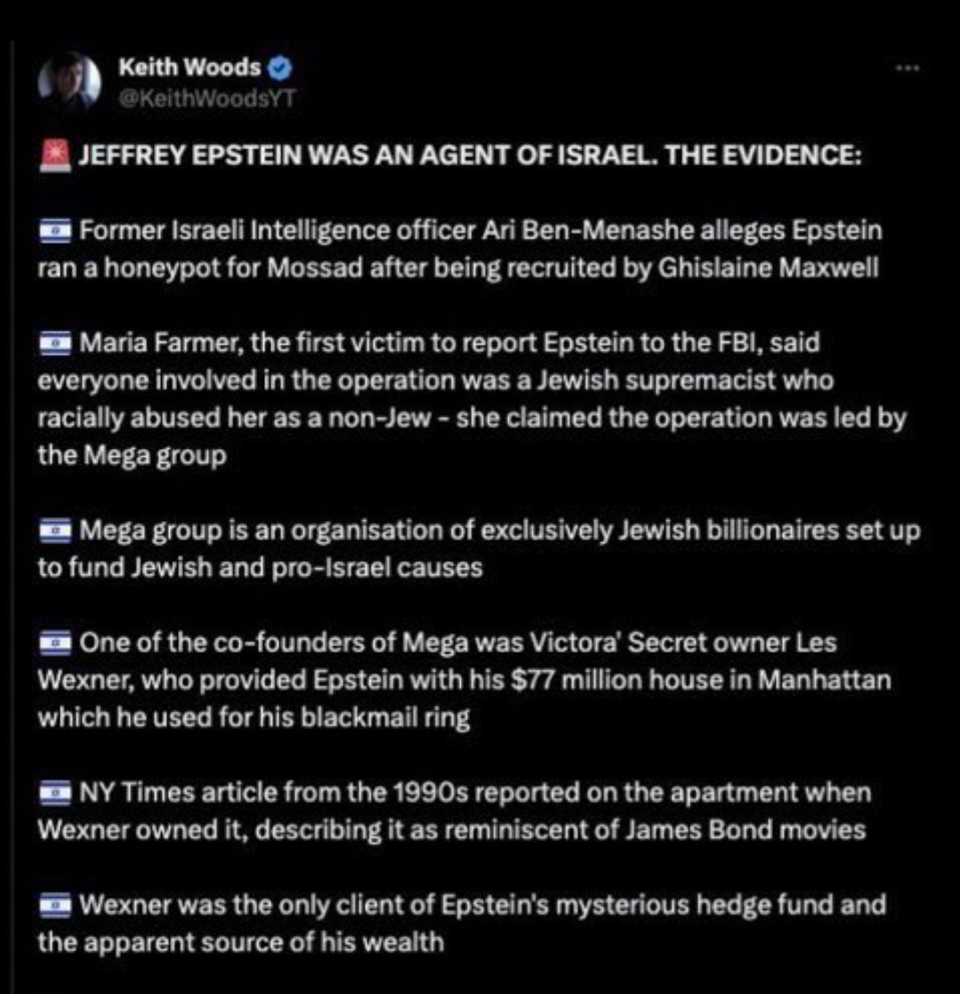 🚨 JEFFREY EPSTEIN WAS AN AGENT OF ISRAEL. THE EVIDENCE: 🇮🇱 Former Israeli Intelligence officer Ari Ben-Menashe alleges Epstein ran a honeypot for Mossad after being recruited by Ghislaine Maxwell 🇮🇱 Maria Farmer, the first victim to report Epstein to the FBI, said everyone involved in the operation was a Jewish supremacist who racially abused her as a non-Jew - she claimed the operation was led by the Mega group 🇮🇱 Mega group is an organisation of exclusively Jewish billionaires set up to fund Jewish and pro-Israel causes 🇮🇱 One of the co-founders of Mega was Victora' Secret owner Les Wexner, who provided Epstein with his $77 million house in Manhattan which he used for his blackmail ring 🇮🇱 NY Times article from the 1990s reported on the apartment when Wexner owned it, describing it as reminiscent of James Bond movies 🇮🇱 Wexner was the only client of Epstein's mysterious hedge fund and the apparent source of his wealth 🇮🇱 Epstein was hired to work for Bear Stearns in 1970 by Alan Greenberg, another member of Mega group. Prior to this Epstein was just a school teacher 🇮🇱 Mega group member Ronald Lauder is president of the World Jewish Congress and has been a big donor to Netanyahu's Likud party 🇮🇱 Epstein's associate Ghislaine Maxwell is the daughter of Robert Maxwell, a top Mossad spy. 🇮🇱 Robert Maxwell's business partner was Charles Bronfman, a co-founder of the Mega group 🇮🇱 Epstein's lawyer and long-time friend Alan Dershowitz is an ultra-Zionist, author of The Case for Israel, and was considered by Israel to represent them at the ICJ 🇮🇱 Epstein had multiple meetings with former Israeli PM Ehud Barak in his New York apartment 🇮🇱 Les Wexner's Wexner Foundation gave Barak $2 million in 2004 for still unspecified research 🇮🇱 Barak says he was first introduced to Epstein by former Israeli Prime Minister Shimon Peres, who gave a eulogy at Robert Maxwells funeral 🇮🇱 Epstein and Barak were business partners in a tech company - the company’s executive team were all former members of Israeli intelligence The conclusion is unavoidable: Jeffrey Epstein was running a blackmail operation for Israel, backed by very powerful and connected Zionists with ties to the very top of the Israeli government.