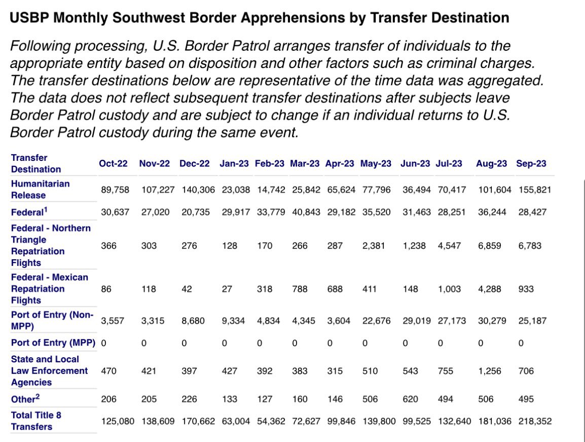 When Title 42 ended in May, the Biden admin warned that migrants would face “tougher consequences” if they were caught crossing the border illegally. But new CBP data reveals Border Patrol released almost 156,000 migrants into the US in September alone. 156k in *one month*. https://t.co/vGjd2JivaH