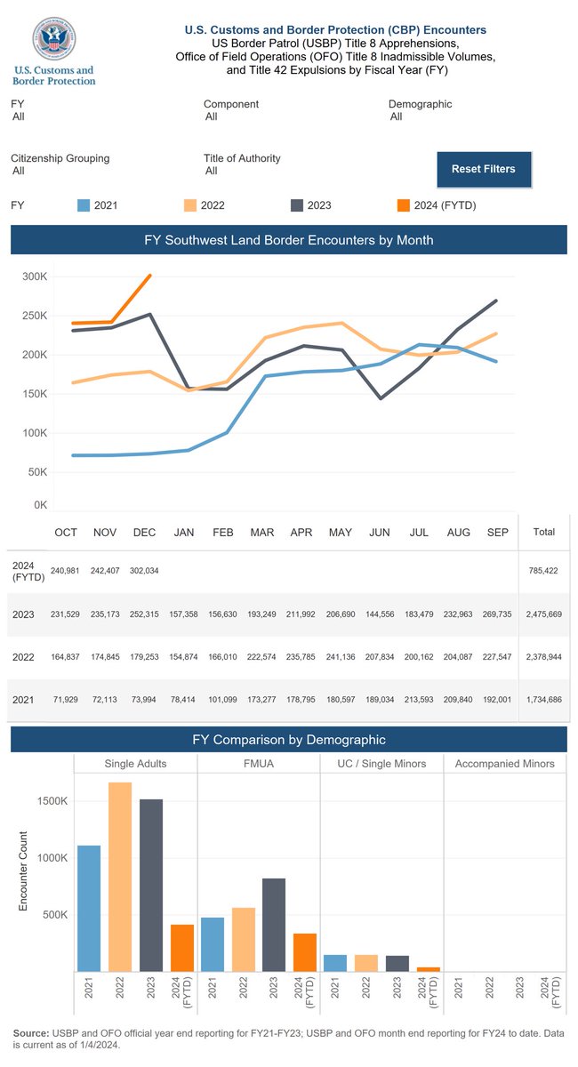 By all available metrics, this administration's border policy is a disaster. Monthly Encounters have averaged: - 98,000 for the two previous administrations. - 242,000 for the Biden border. In fact, the flood of humans entering is so vast that Apprehensions alone now exceed the combined Encounters metric of the previous administrations. Monthly Apprehensions have averaged: - 34,000 for the previous two administrations. - 111,000 for the Biden border. And these averages understate the current situation -- it's getting worse every month. December 2023 was the worst single month in history at the southern border.