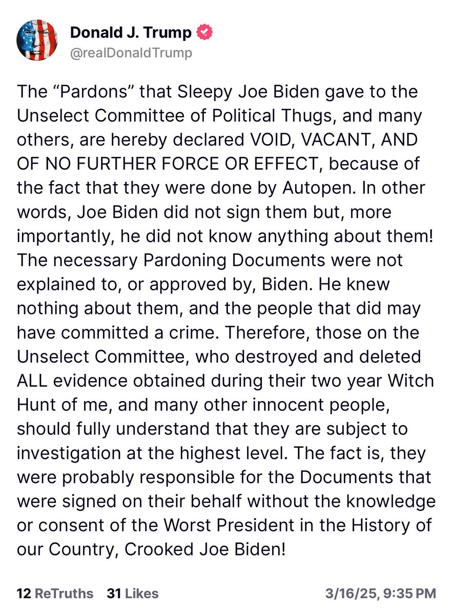 Joe Biden’s pardons have all been rendered null and void. The autopen signed them. He did not. https://t.co/Z0ghql2JoL