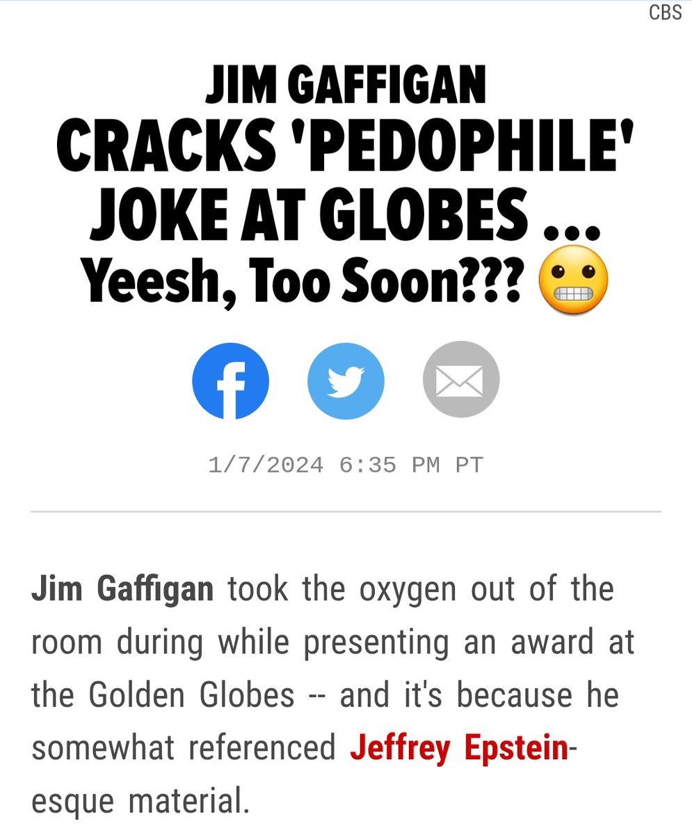 Are you trying to get ahead of things Jim? I think you know what is coming for you. Let's discuss why. Remember when you went on a tirade about Donald Trump ruining the country? You even said for you this wasn't a debate about the size of government, taxes, health care or even abortion.” Which implies you hasmd other personal issues with D. Trump that goes much deeper than what you are willing to admit because it may be connected to that infamous Jeffrey Epstein Island right? Because I also remember in this film "Drunk Parents" that came out in 2019 where you were registered as a sex offender In this comedy film, you Gaffigan portrays Carl, a neighbor who moves in next door to Alec Baldwin and Salma Hayek's characters. While your character Carl is never explicitly labelled a sex offender, his character introduction includes mention of him being registered on some sort of offender list. But that is just a movie right? Getting back on topic remember when you called people bots who believed Hollywood was one big P*dophile ring? Qoute: “Through numerous messages I learned that while Trump wished Epstien’s partner/groomer “Well”, the Democrats are the ones who are supposedly pro-pedophile. It became abundantly clear that many, many people really do believe Hollywood and the entertainment industry is an enormous pedophile ring. I know that sounds absurd, but I received dozens of messages from people convinced this was true.” End quote. You said this back in August 2020 when you were being interviewed from Dustin Rowels from http://Pajiba.com. Now that The list is out you seemed a bit nervous up their on stage tonight. Is something bothering you Jim? https://www.google.com/amp/s/amp.tmz.com/2024/01/07/jim-gaffigan-cracks-pedophile-joke-during-golden-globes/