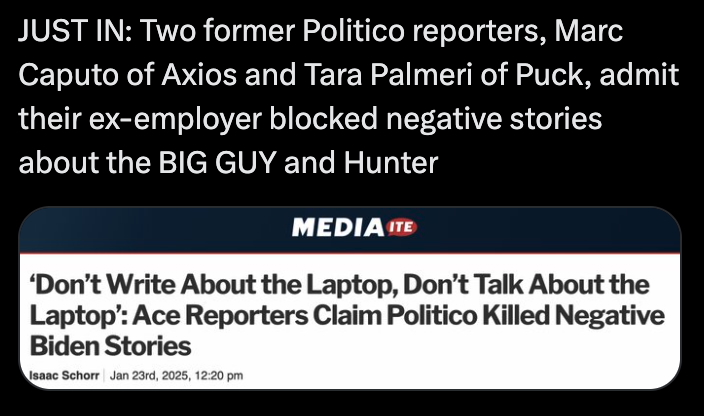SHOCK: Ex-Politico reporters reveal ‘cowardly editors’ buried bombshell Hunter Biden laptop stories – fueled ‘misinformation’ narrative involving ex-prez. https://nypost.com/2025/01/23/us-news/ex-politico-reporters-reveal-cowardly-editors-buried-bombshell-hunter-biden-laptop-stories-other-scoops/