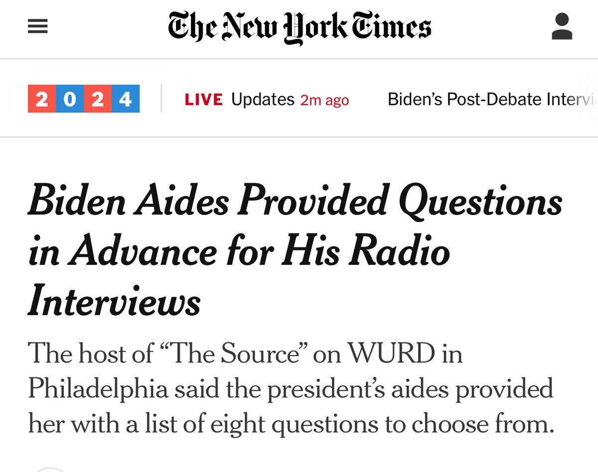 The White House press shop must answer this immediately. Suggesting topics is one thing, but scripting out questions for a reporter? It's all been a Truman Show, folks. American people deserve better than a scripted, false reality. NYT: "The questions asked of President Biden by two radio interviewers this week were provided in advance to the hosts by Mr. Biden’s aides at the White House, one of the hosts said Saturday morning on CNN." https://www.nytimes.com/2024/07/06/us/politics/biden-radio-interviews-questions.html
