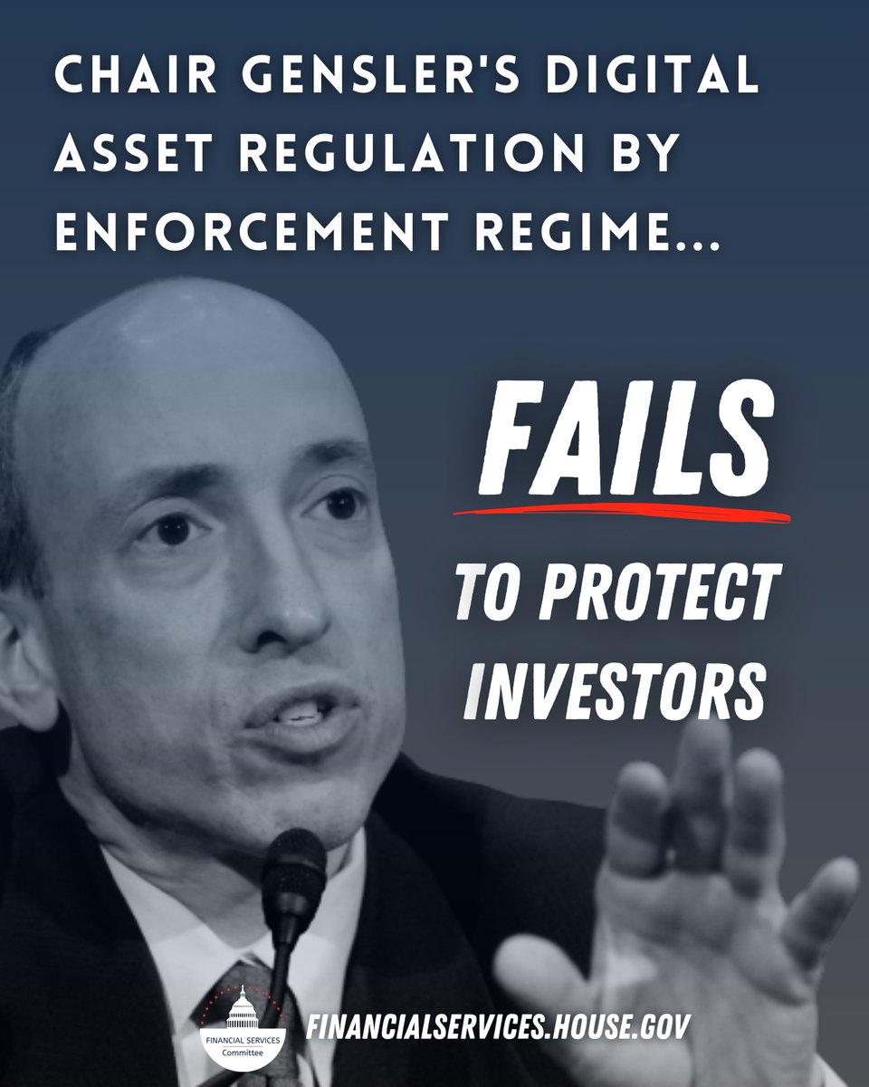 SEC Chair Gary Gensler's regulation by enforcement regime for digital assets failed to protect @FTX_Official's investors and customers. Republicans are delivering legislative clarity that protects consumers and fosters innovation in the digital asset ecosystem.
