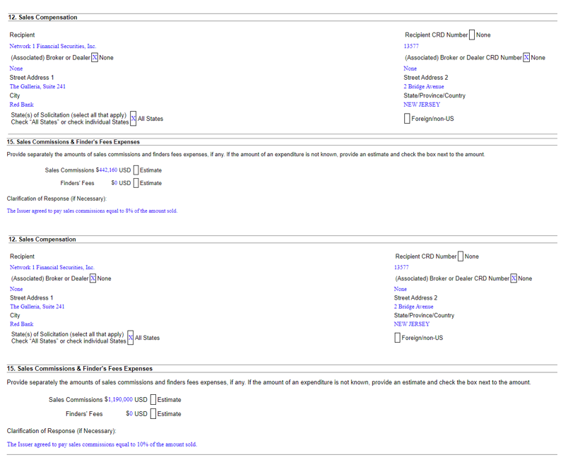 They have paid in excess of $1.5 million in sales commissions to a NJ based outfit called Network 1 Financial Securities