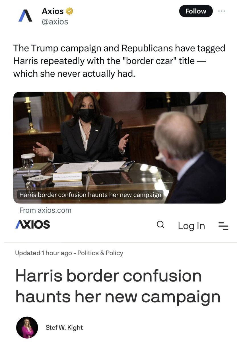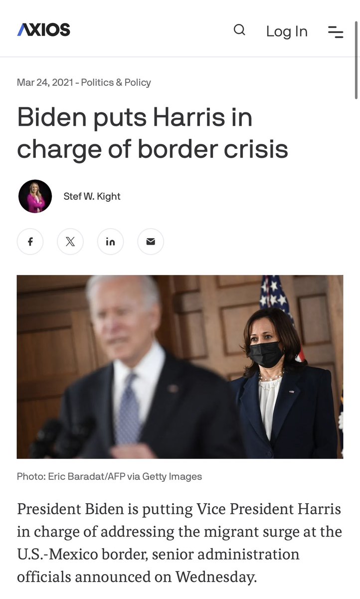 .@axios is trying to rewrite history by claiming Kamala is not in charge of the border. Not only did they themselves write in 2021 that Kamala is in charge of the border, but it was written by the same author!!! Unfreakingbelievable. @StefWKight https://t.co/Zx8OFvtZLH